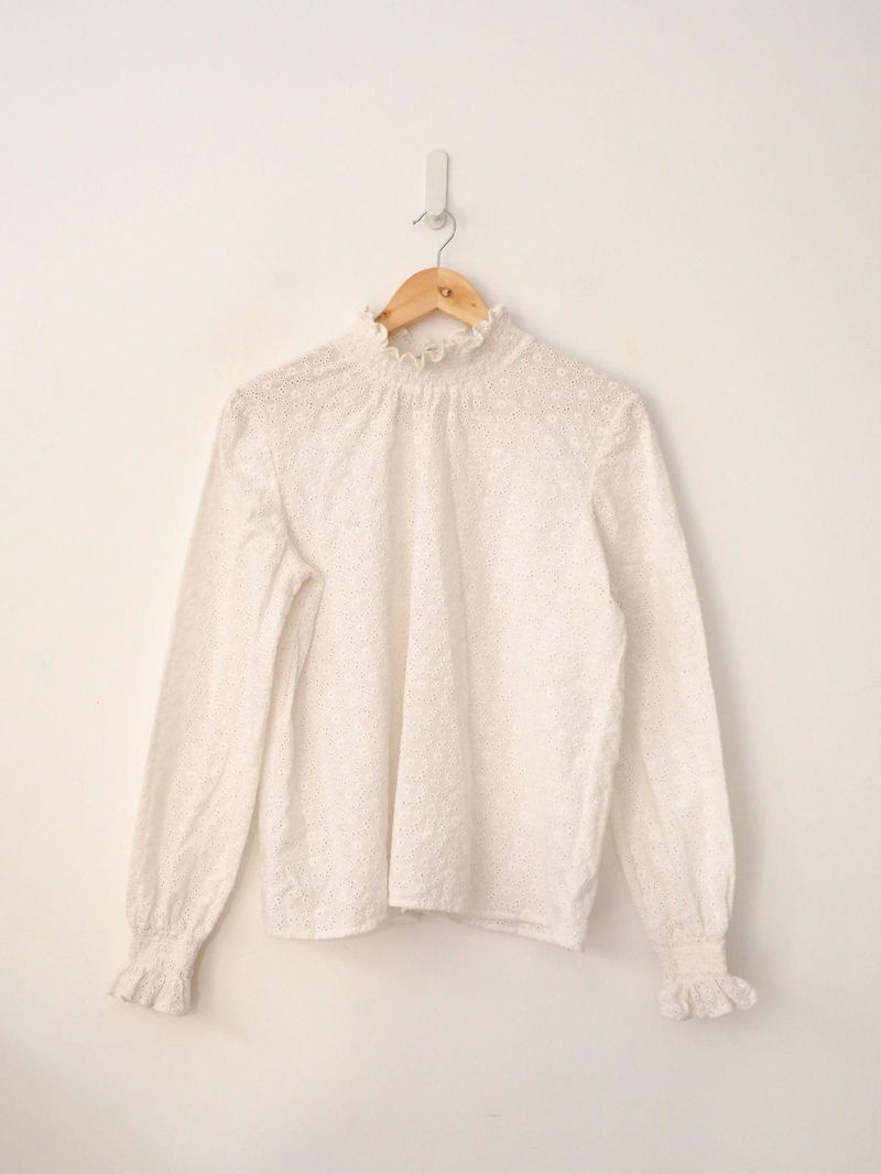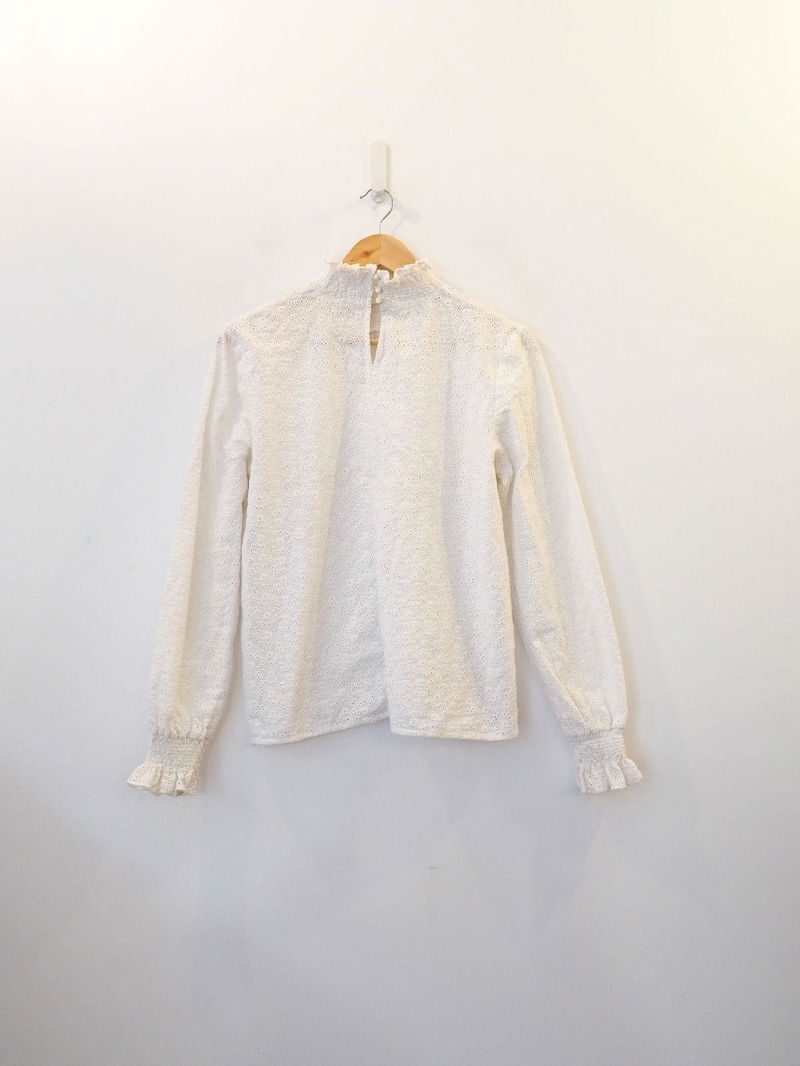Ruffle neck broderie anglaise blouse with back button detailing. ( there are some stains on the neck of the blouse and price is reflective of this)