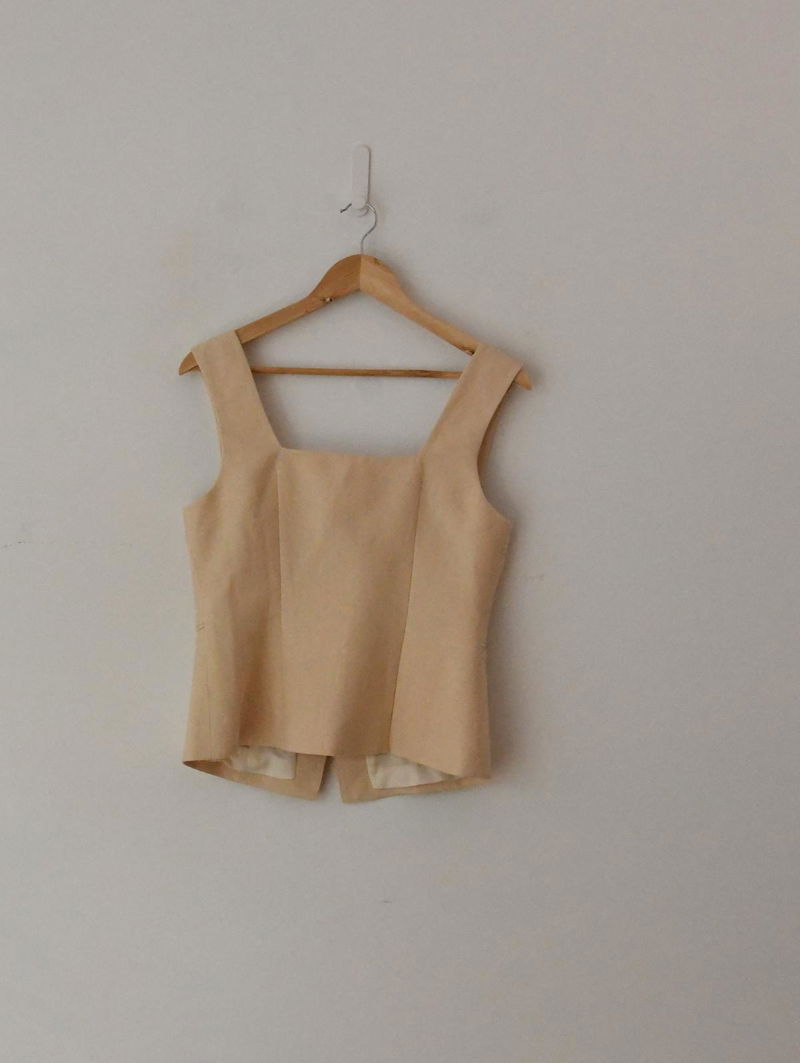Sleeveless linen blouse. Square neckline. Front center closure with covered buttons. Piped pockets. Fitted and Lined.