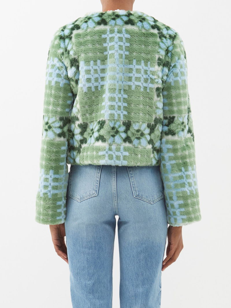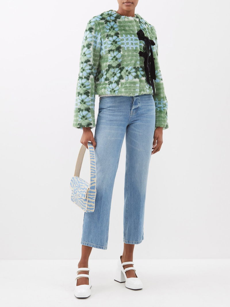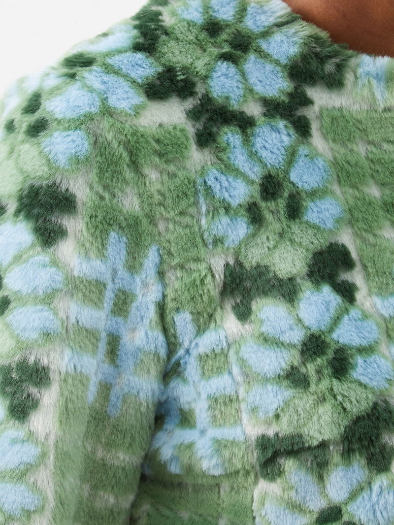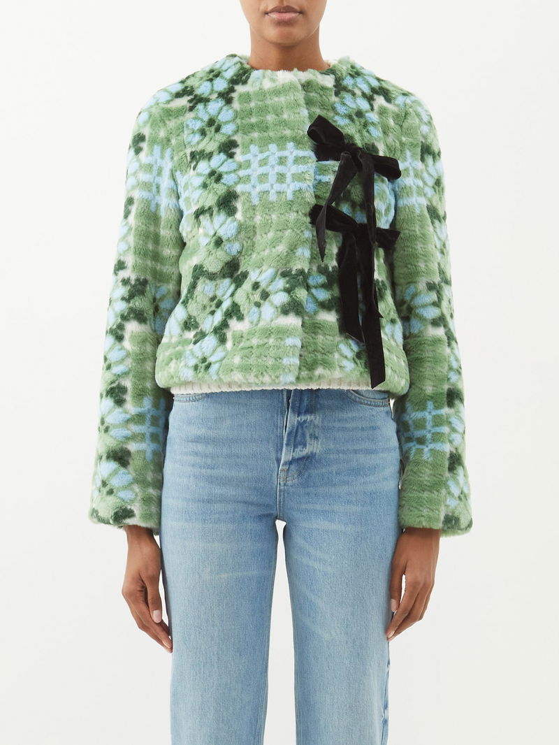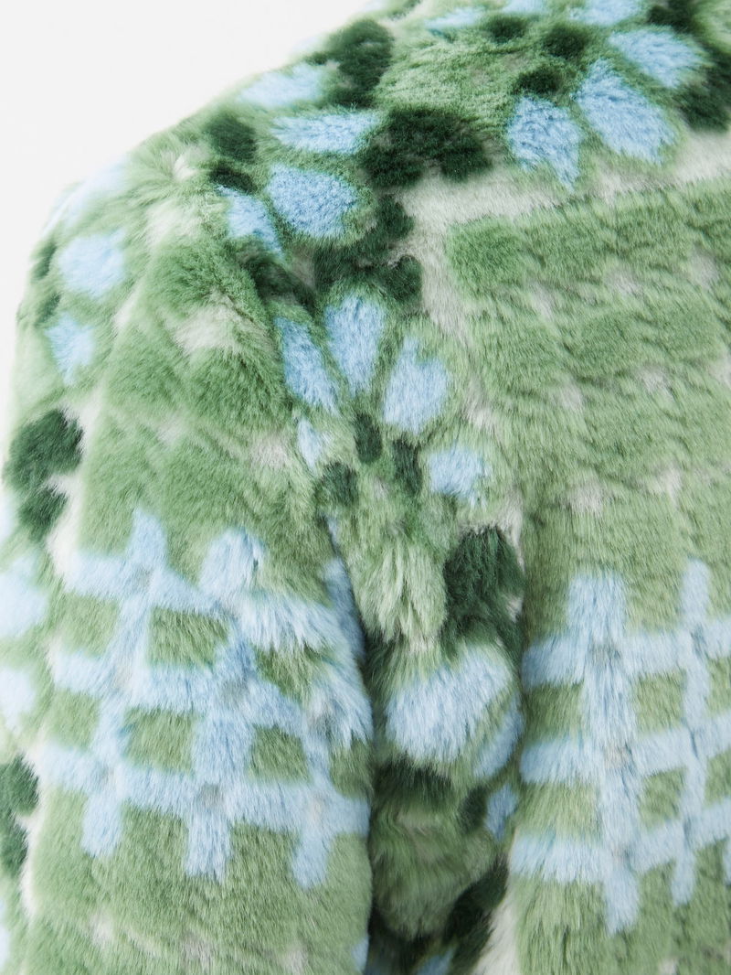 Shrimps' Pre-AW22 Lucas jacket is made from green and blue faux fur that's printed with florals and gingham motifs, and accented with black bow appliqués.
