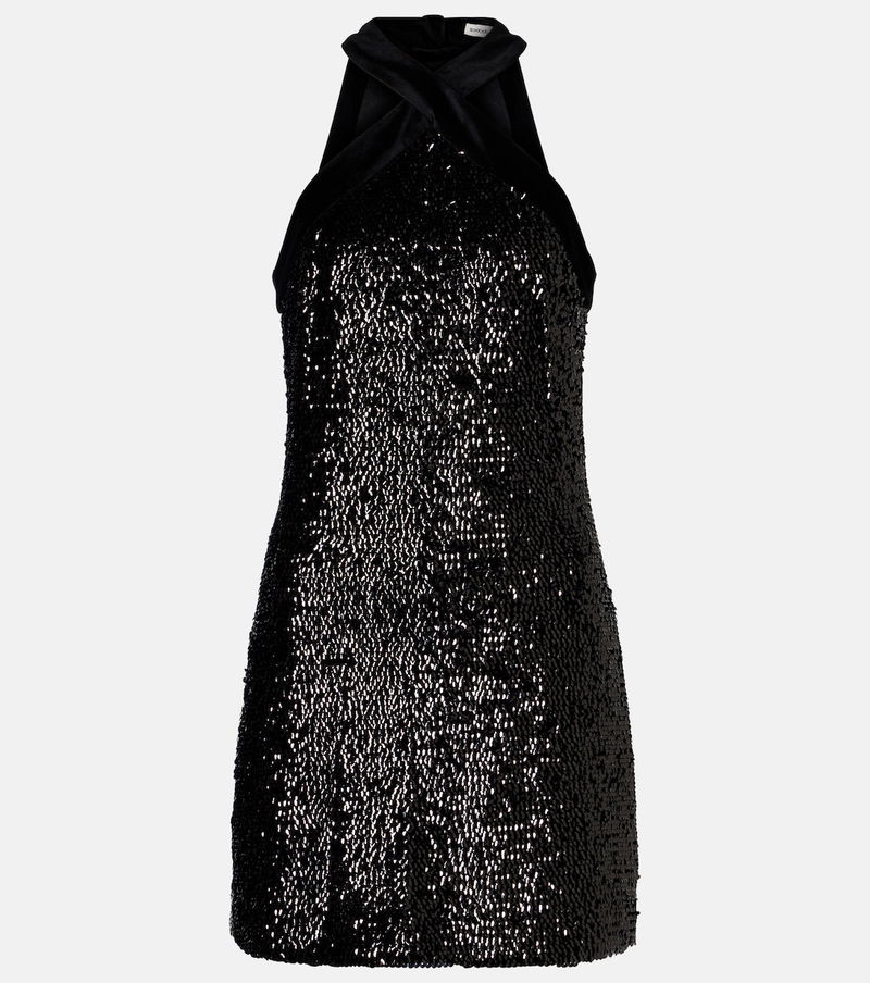 Inspired by sculpture and architecture, Simkhai's designs combine innovative construction with hand-detailing. The Isla minidress stands out with glittering sequin embellishments throughout, complemented by a velvet halterneck that ties into a bow at the back.