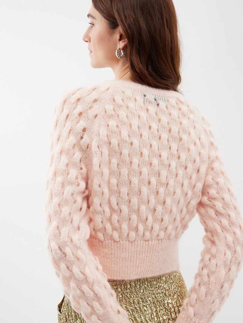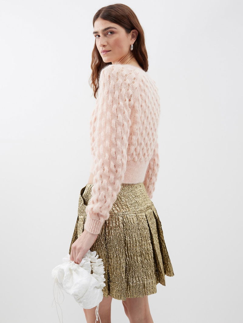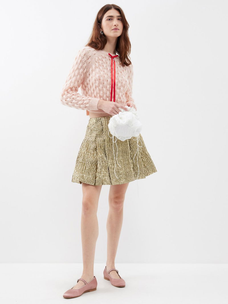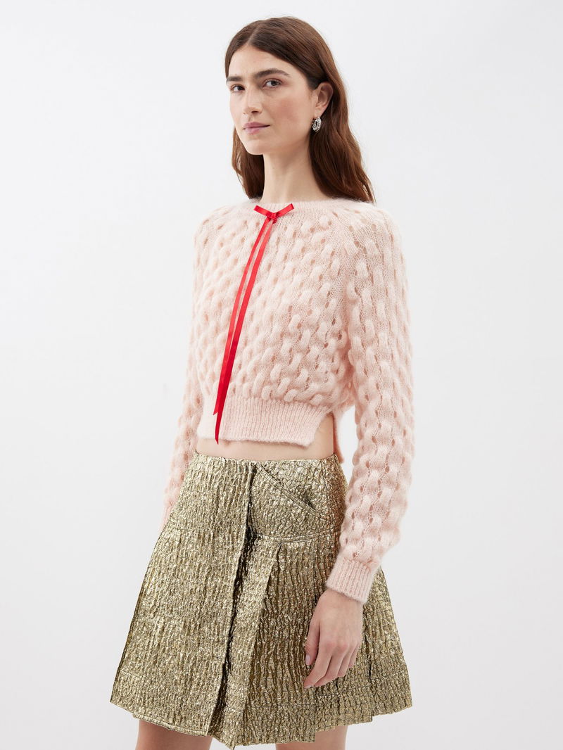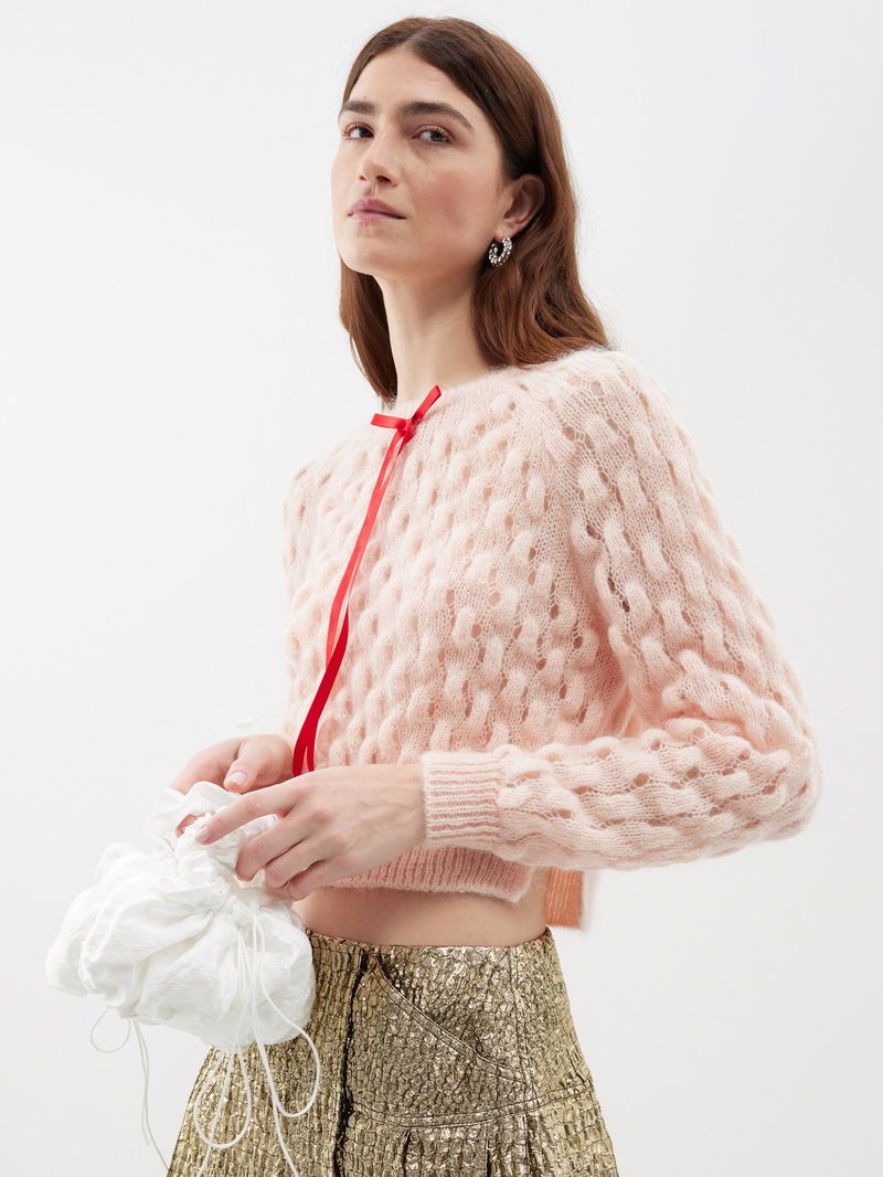 Simone Rocha’s peach-pink sweater is chunky-knitted from a mohair blend and is accented with a red silk ribbon – a recurring motif on the AW23 runway.