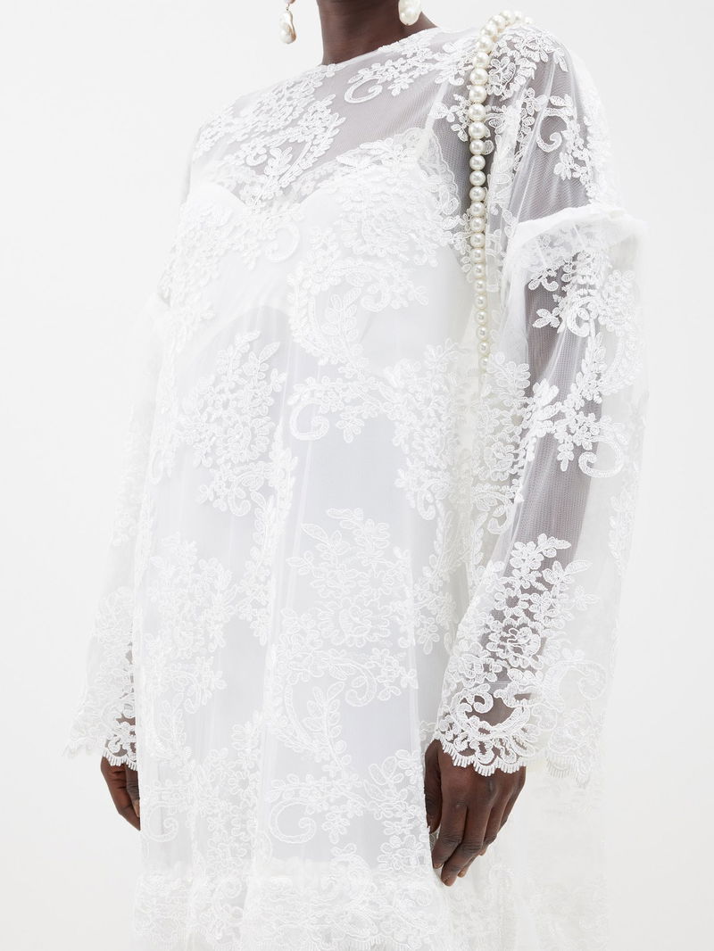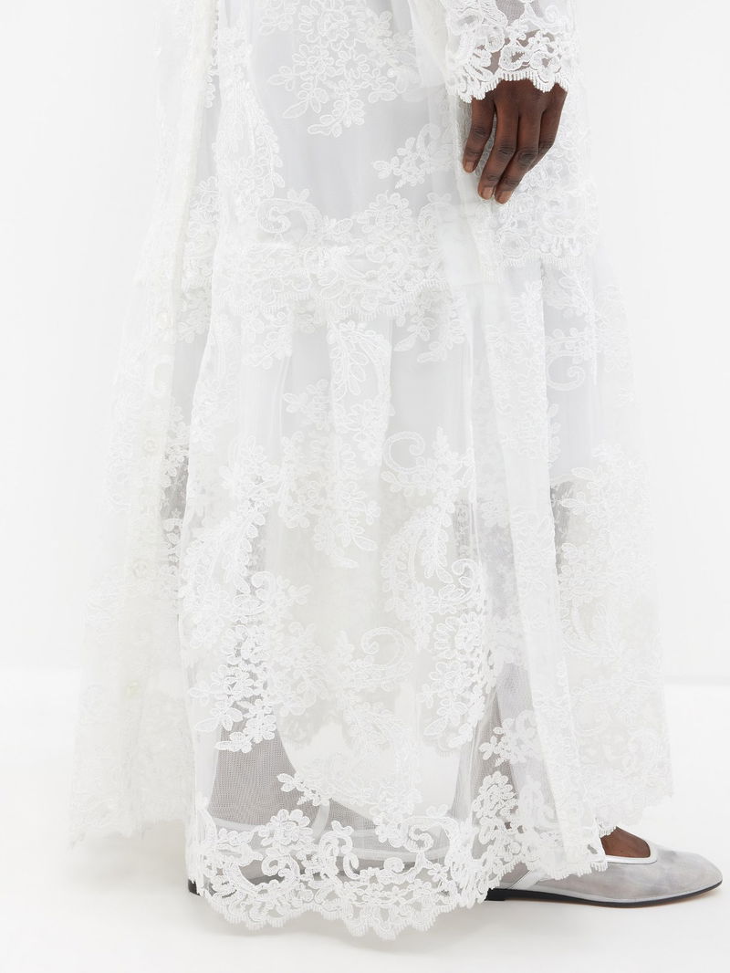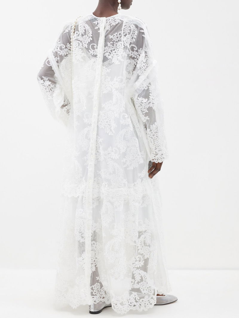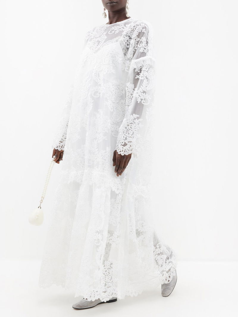 Simone Rocha looks to the romanticism of the Irish ritual of relationships ‘Lughnasadh’ for the AW23 runway where this voluminous ivory floral-lace maxi dress debuted.
