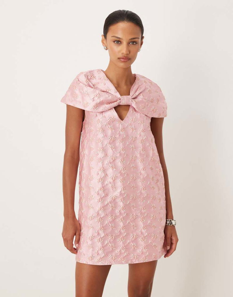 Cameo Floral Jacquard Bow Cape Sleeve Mini Dress In Pink