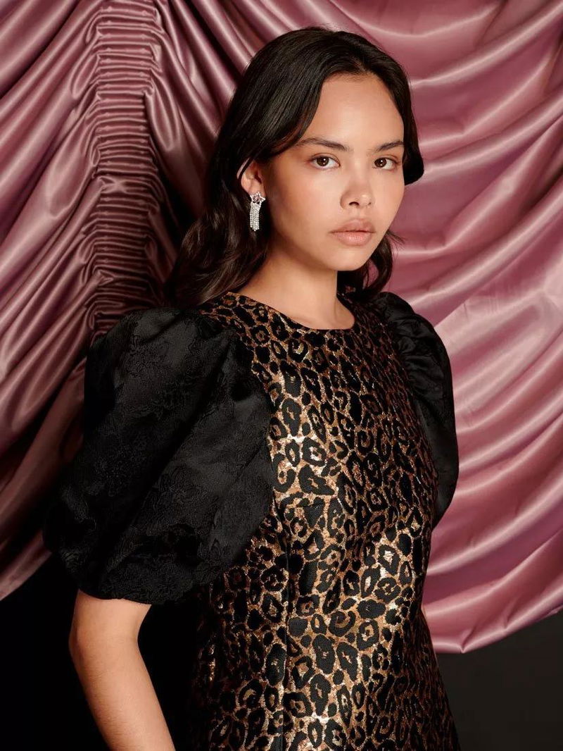 Mini length dress in a leopard jacquard fabric. Fully lined with contrast puff sleeves with cuffs.