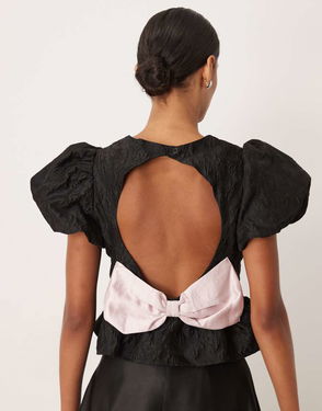 Shawl collar Button-through front Volume sleeves Bow detail Regular fit.