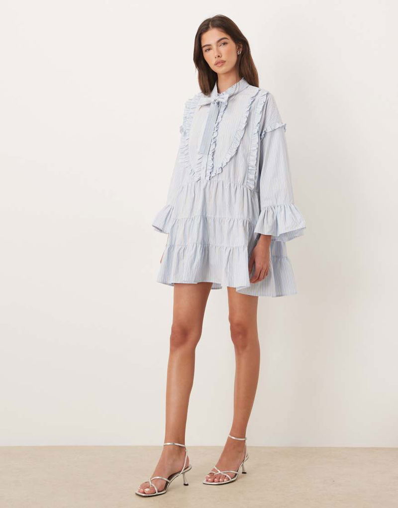 Dawn Pure Cotton Pinstripe Pussybow Bell Sleeve Mini Dress In Blue
