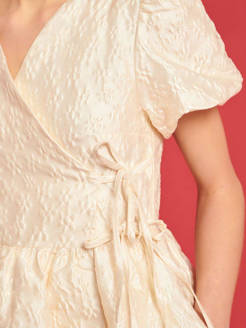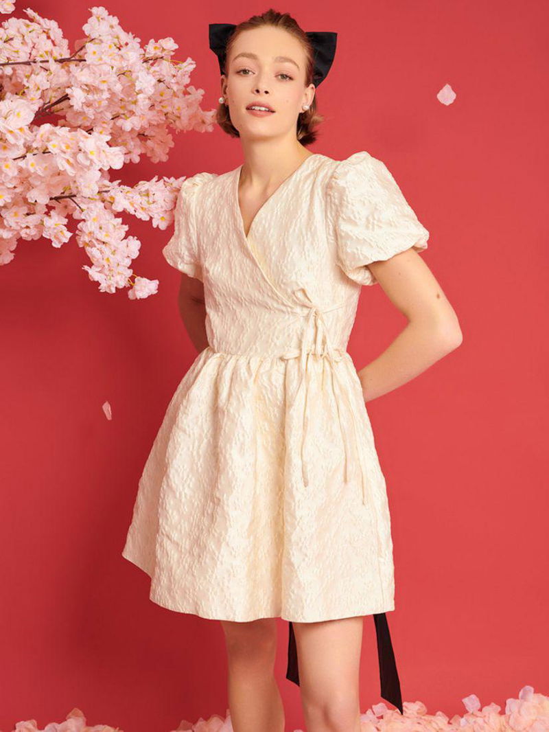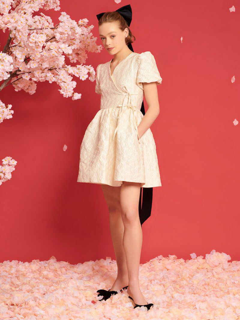 In a wrap over style with a full skirt with side seam pockets, this mini dress from Sister Jane is made in a floral jacquard fabric with a full lining.