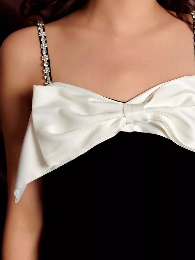 Midi-length dress in a soft velvet fabric. Detailed with a contrast satin bow at the neckline and removable gem-trimmed straps. Fully lined and fastened with a concealed zip.