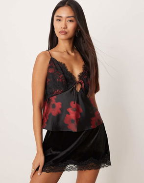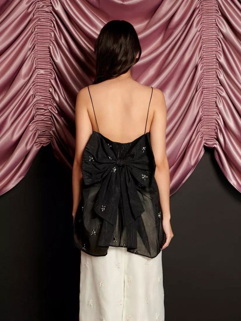 Cami top in a bead-embellished organza fabric. Detailed with a gathered peplum and a decorative bow at the back.