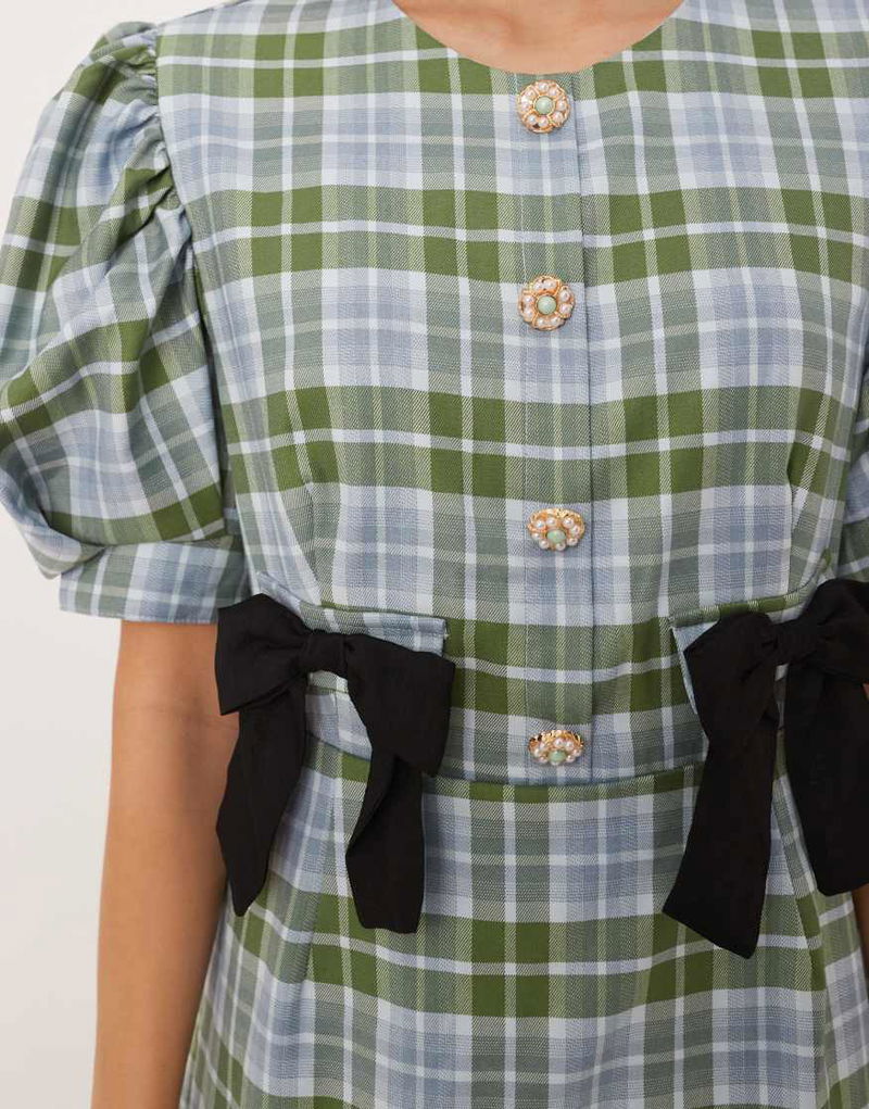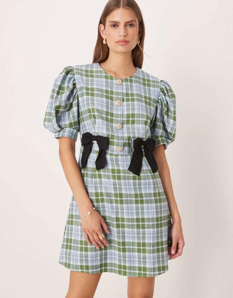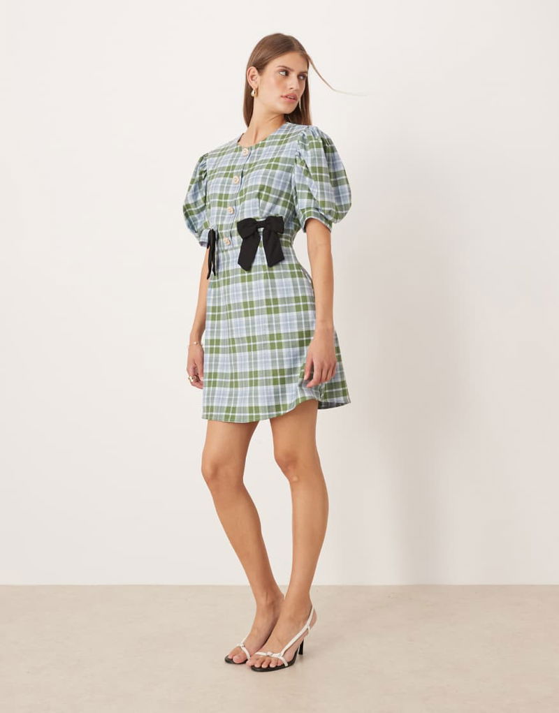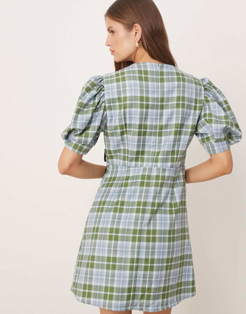 Puff Sleeve Tailored Mini Dress With Bow Detail In Blue And Green Check