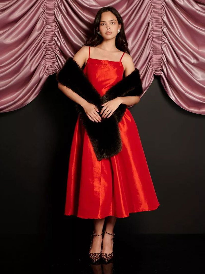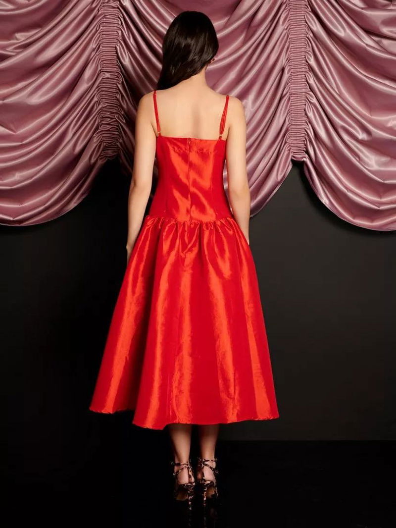 Midi length in a structured taffeta fabric. A fitted bodice paired with a gathered, dropped waist skirt. Detailed with a fixed bow at the neckline and adjustable cami straps.