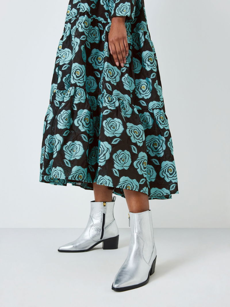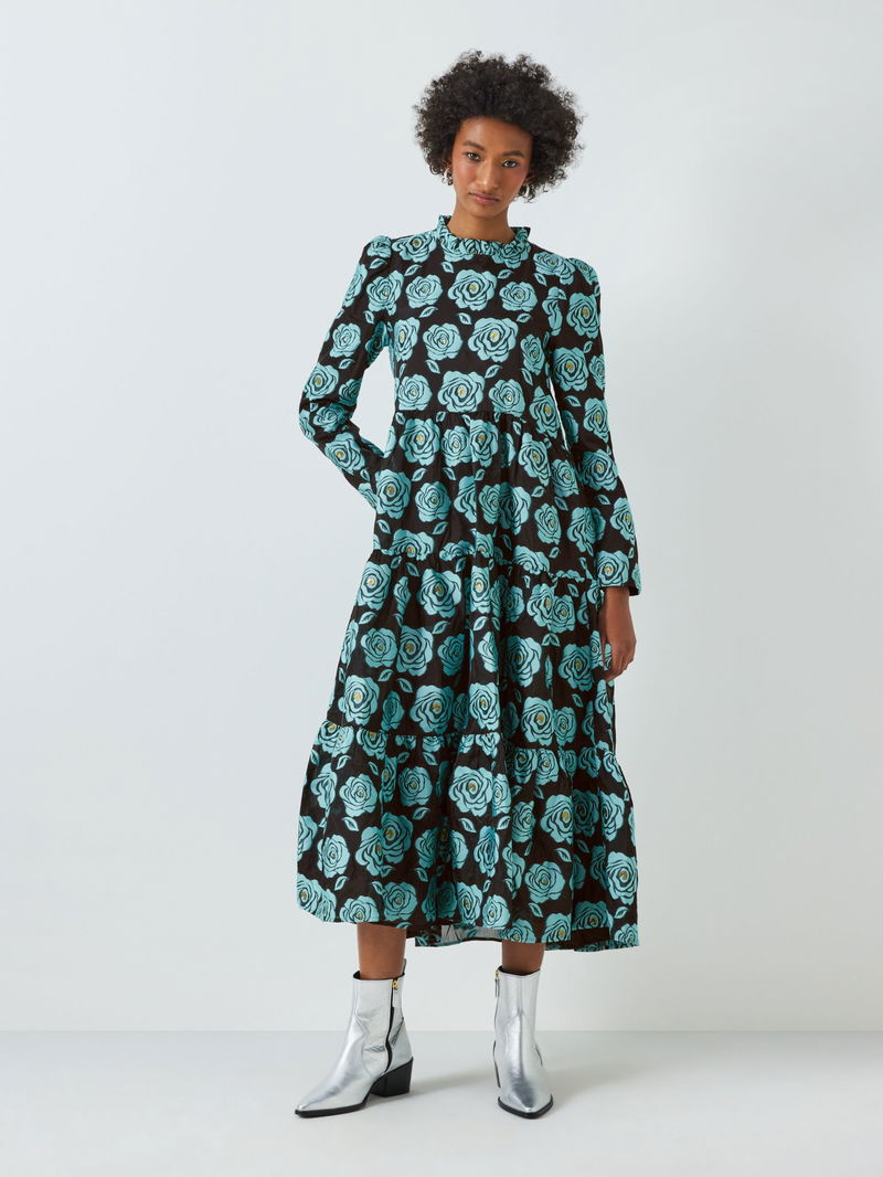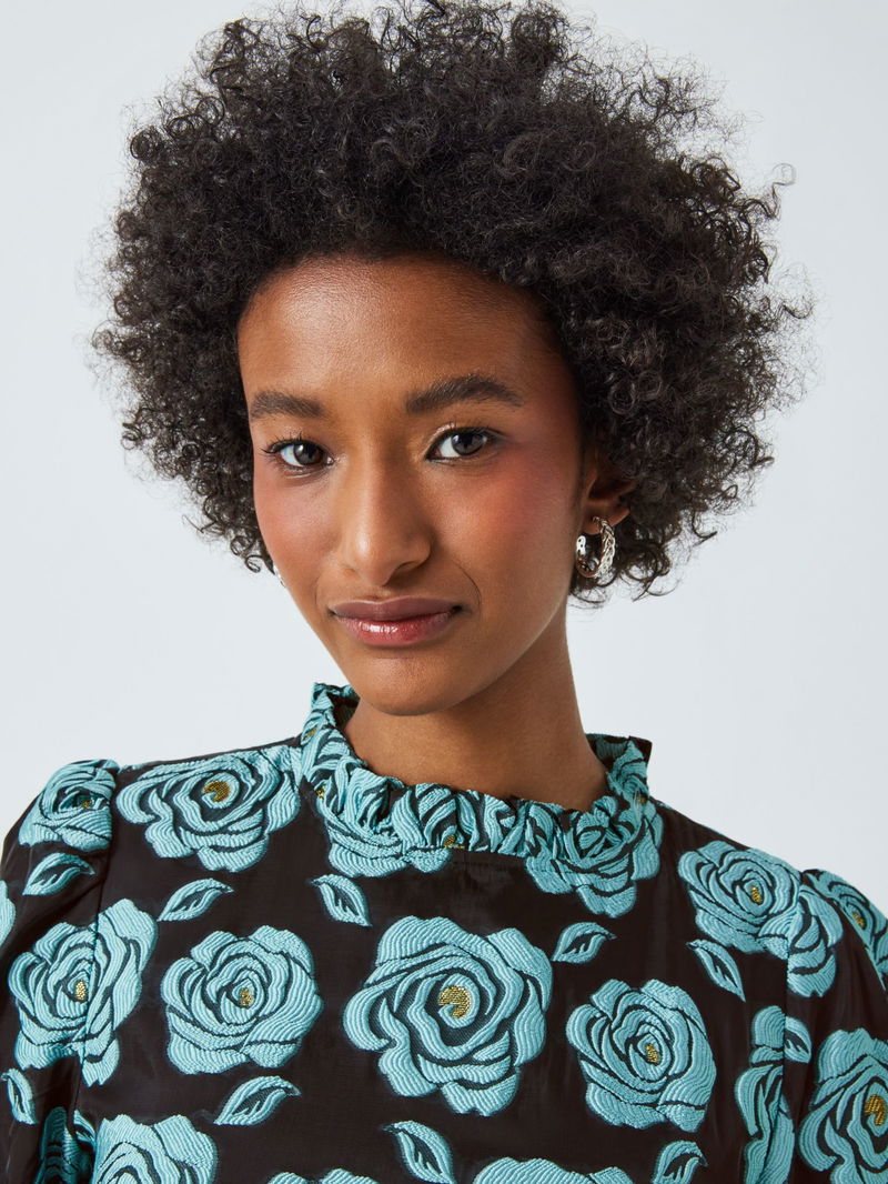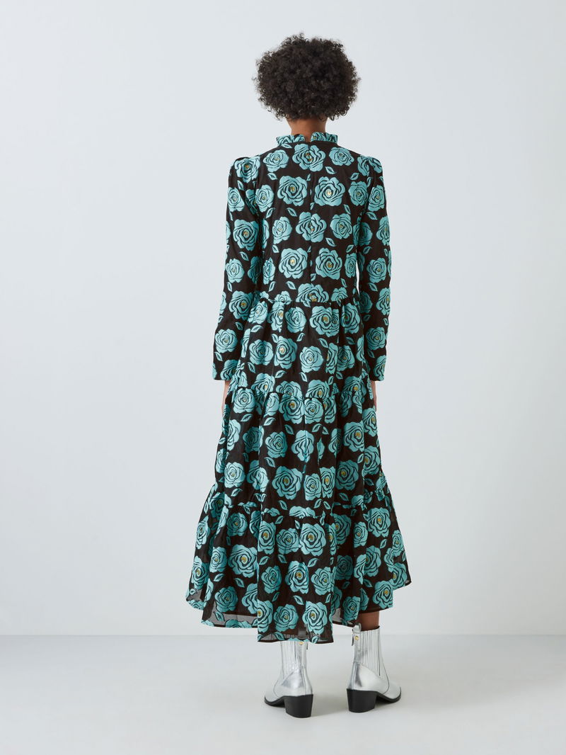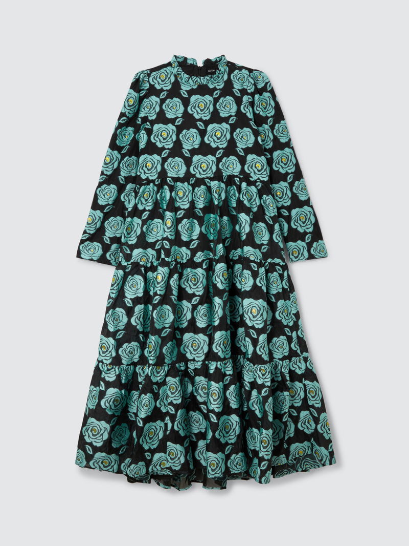 Loose fit midi dress in a floral organza jacquard fabric. Fully lined with a ruffle neckline.