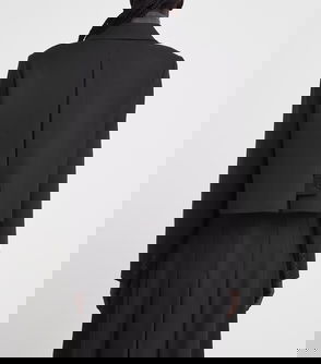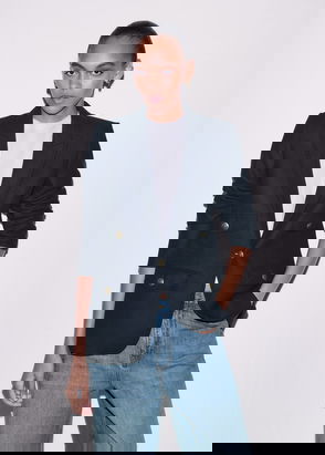 Sleeper linen blazer. Scalloped lapels, padded shoulders, two front faux pockets, button embellishments at cuffs, fully lined. Button fastenings at front.
