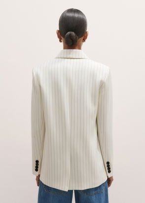 Sleeper linen blazer. Scalloped lapels, padded shoulders, two front faux pockets, button details at cuffs, fully lined. Button fastenings at front.