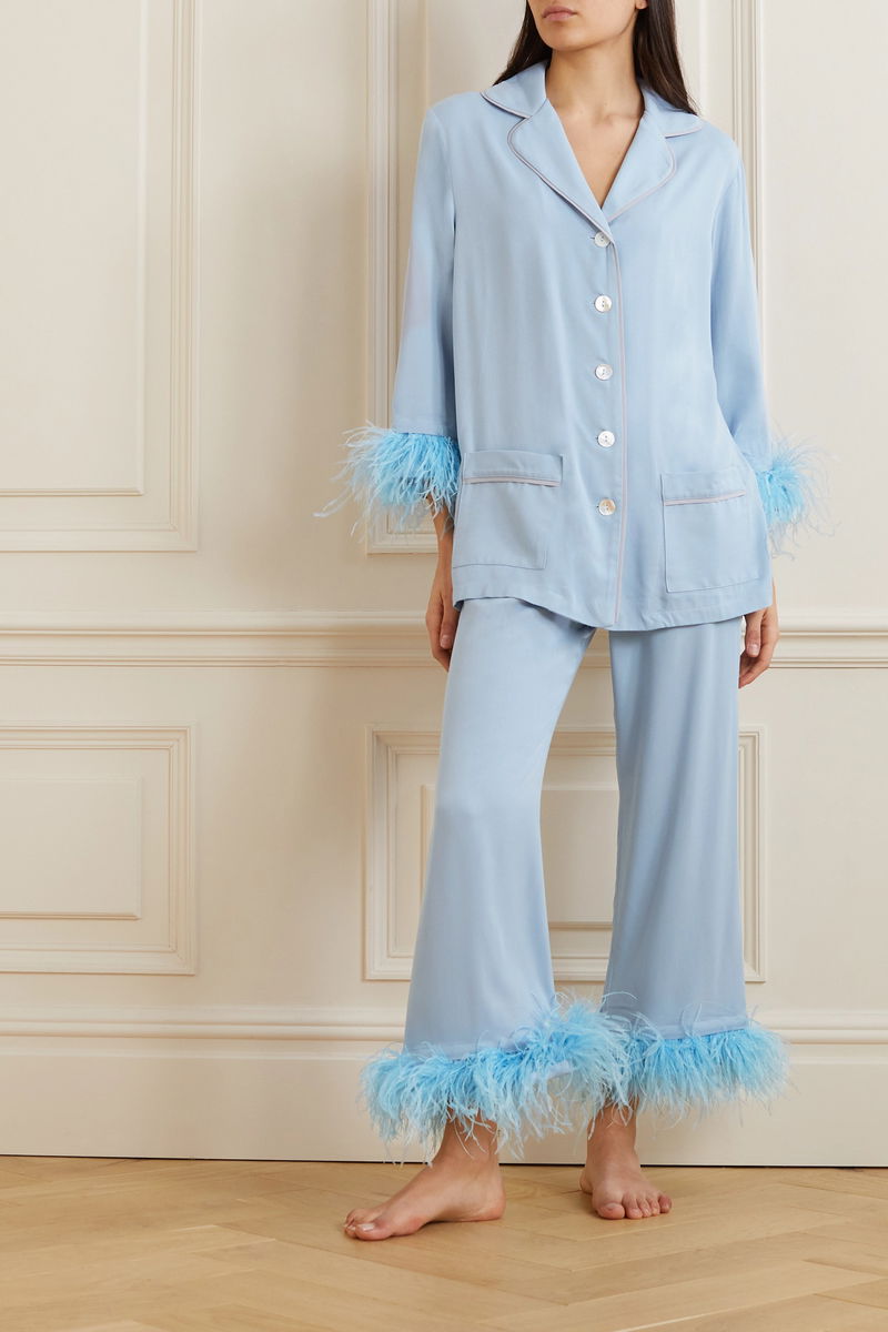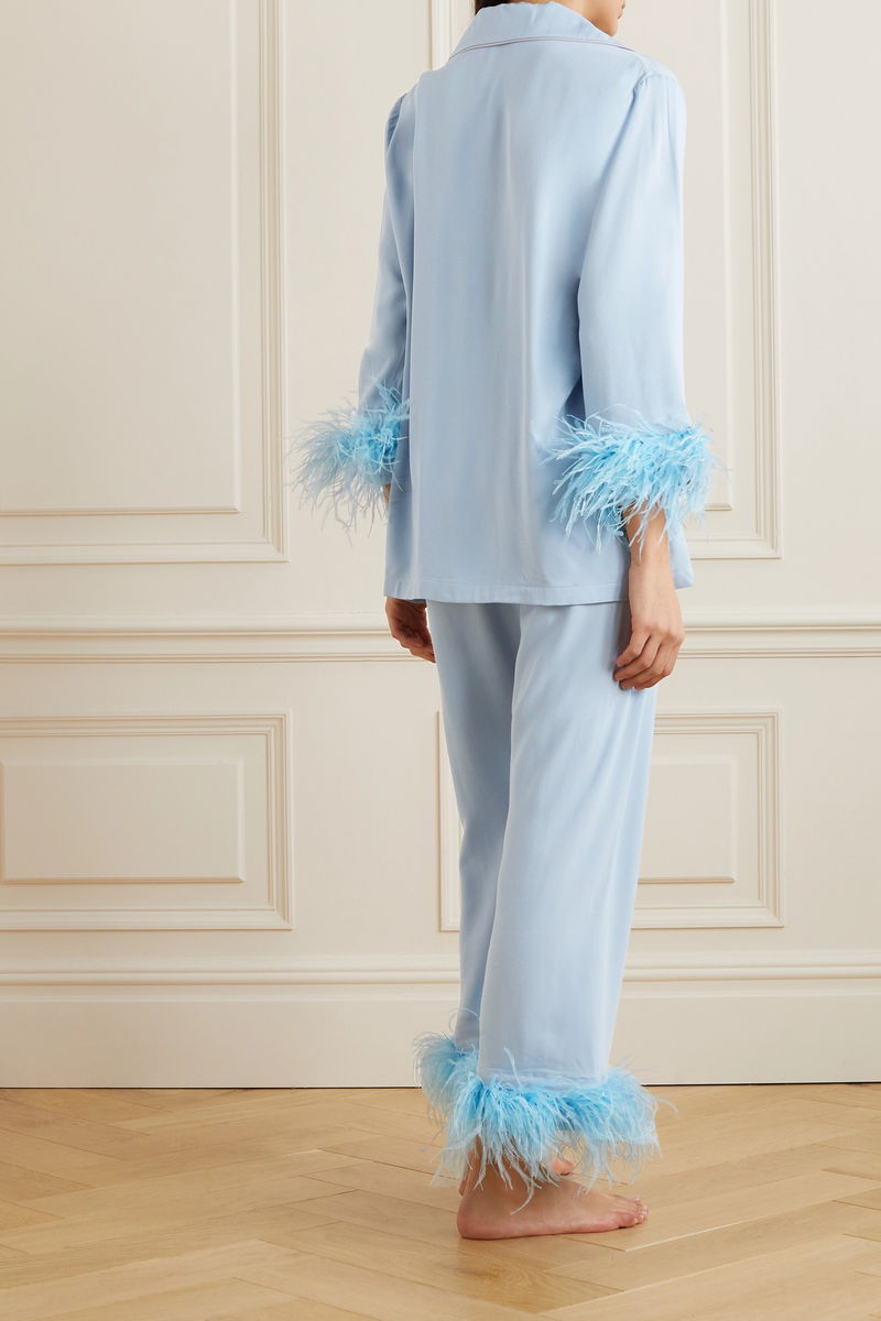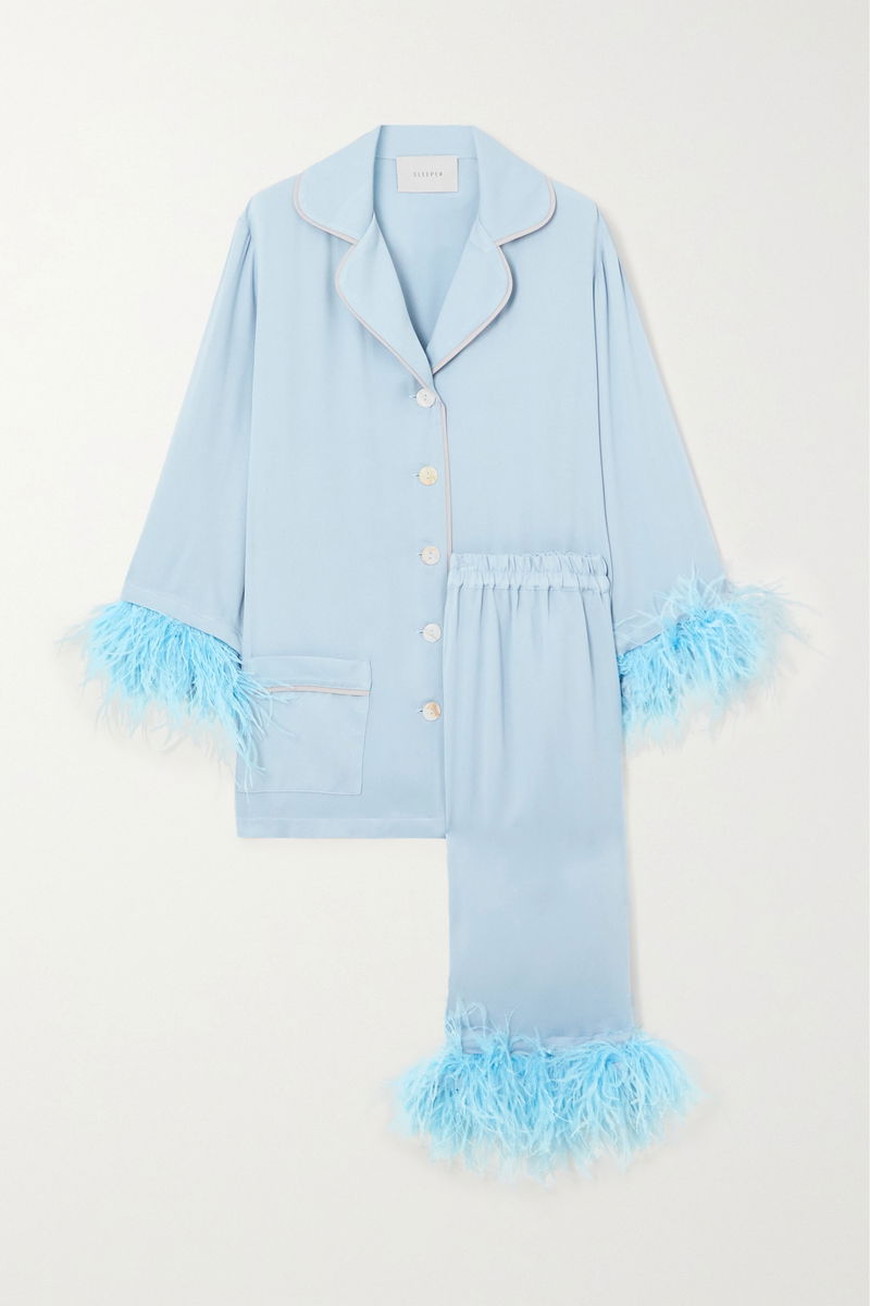 Sleeper's pajamas aren't just for sleeping - they're a fun choice for parties and events, too. This latest set is cut from blue twill that's made using viscose from responsibly managed forests in a bid to protect the lungs of our planet. Detach the playful feather trims to wear yours to bed, or when the occasion calls for a more understated look.