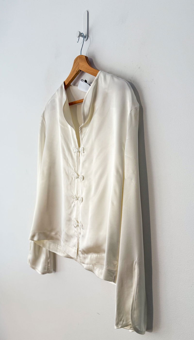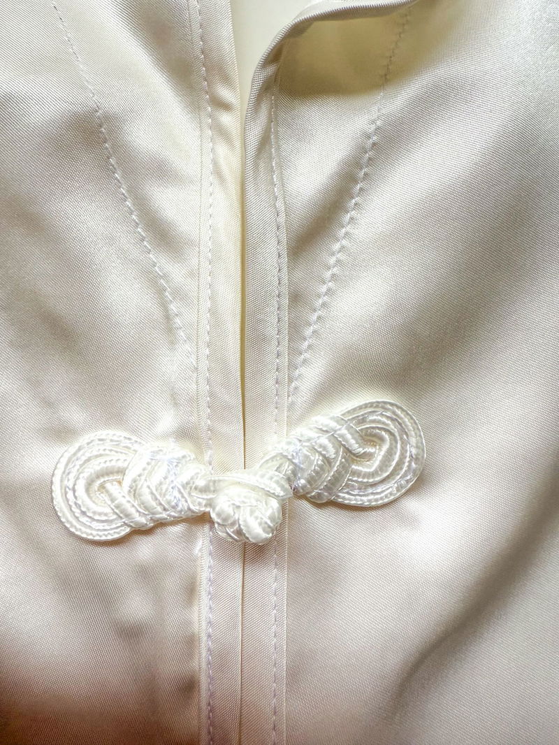 The top fastens with traditional Chinese "frog" buttons, which are handmade by the brand, and the wide pants are topped with an elasticated waistband.