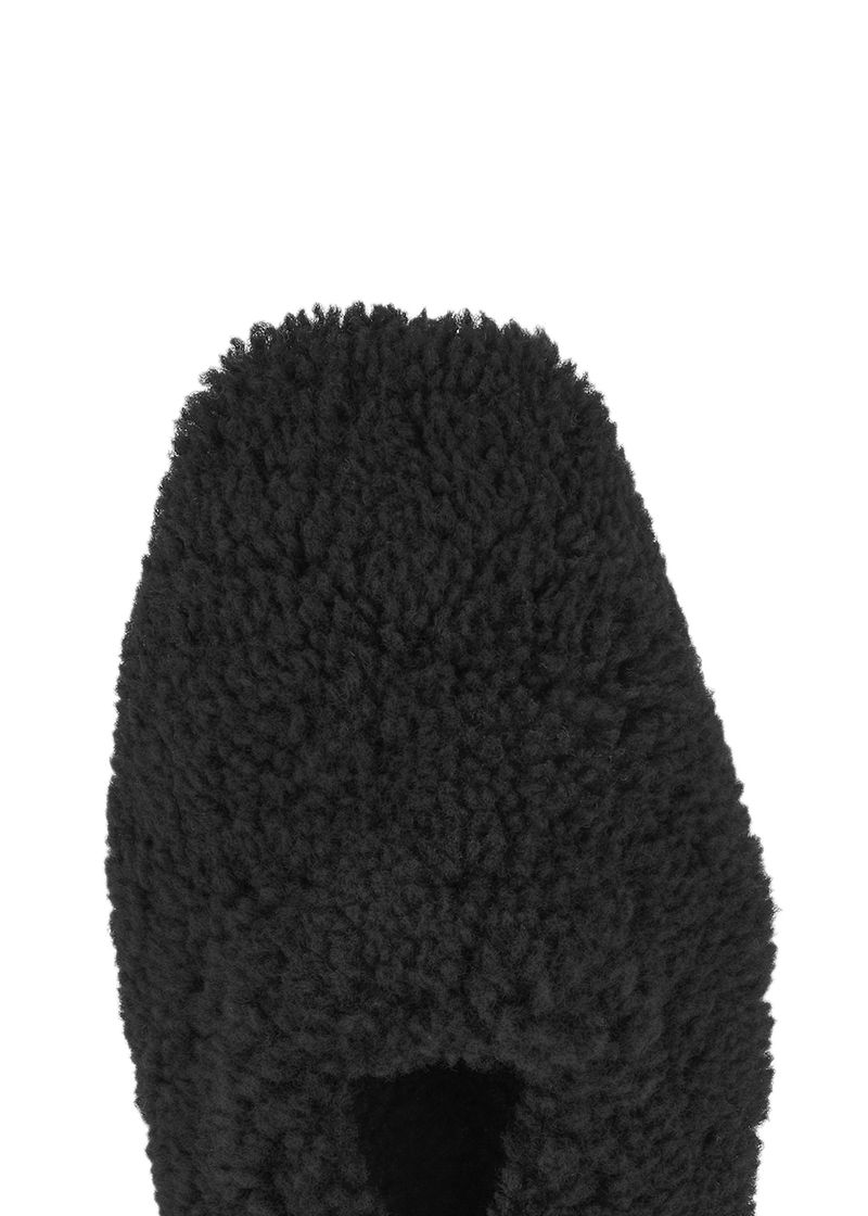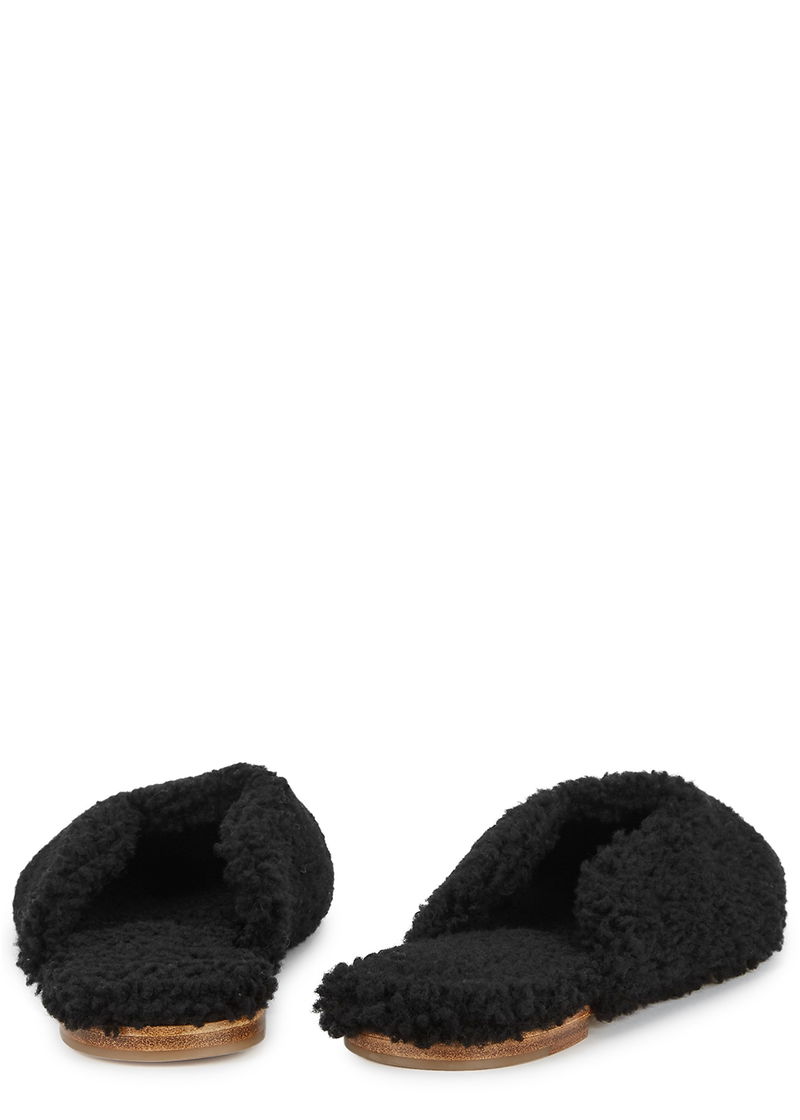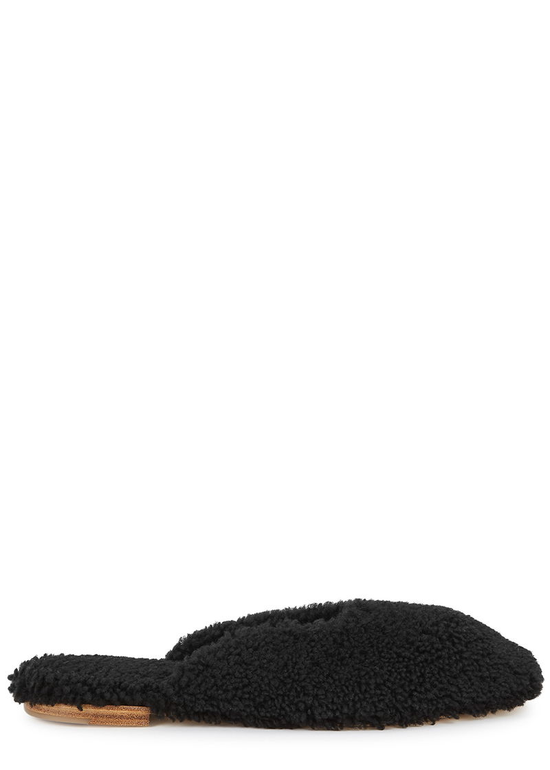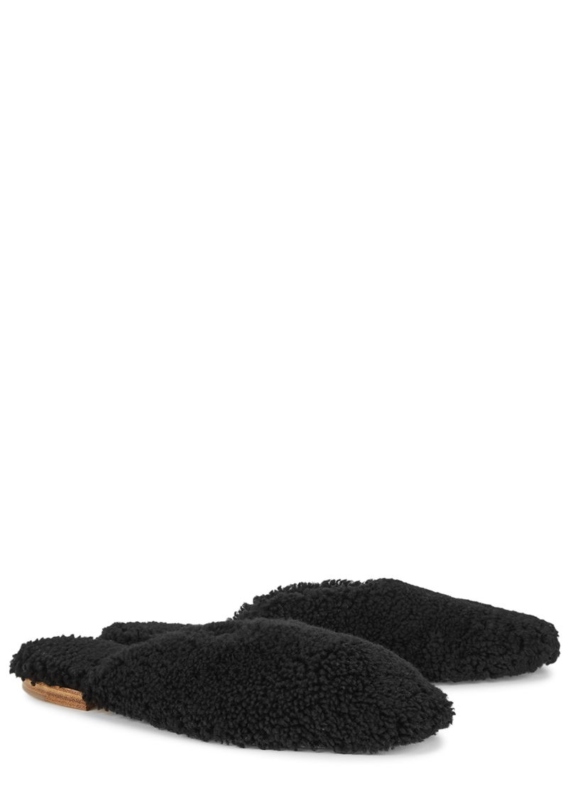 Handmade Sleeper black shearling slippers. Stacked wooden heel, hard leather sole, square toe. Slip-on. Come with a dust bag.