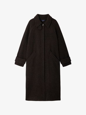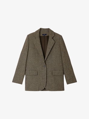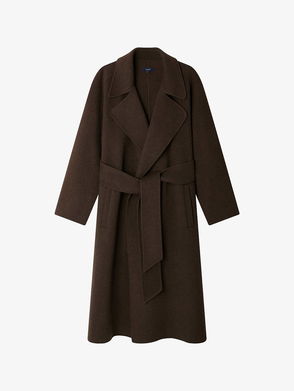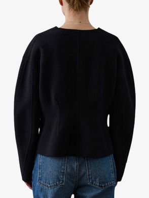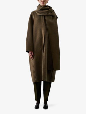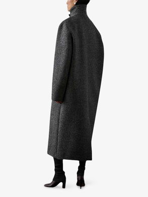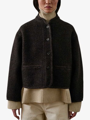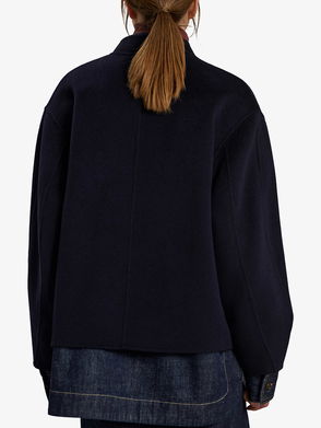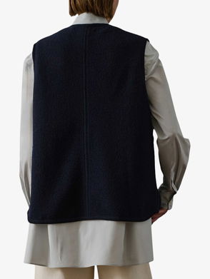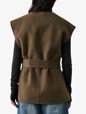 Souer wool-blend jacket. Exposed button fastening at front. Loose fit, high asymmetrical collar, sleeveless, cross-over front, two front patch pockets, double-faced wool.