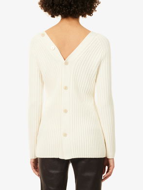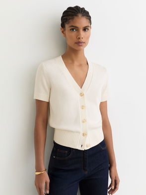 Relaxed-fit, V-neck, long-sleeves, ribbed-trims, cropped length, side split at the hem