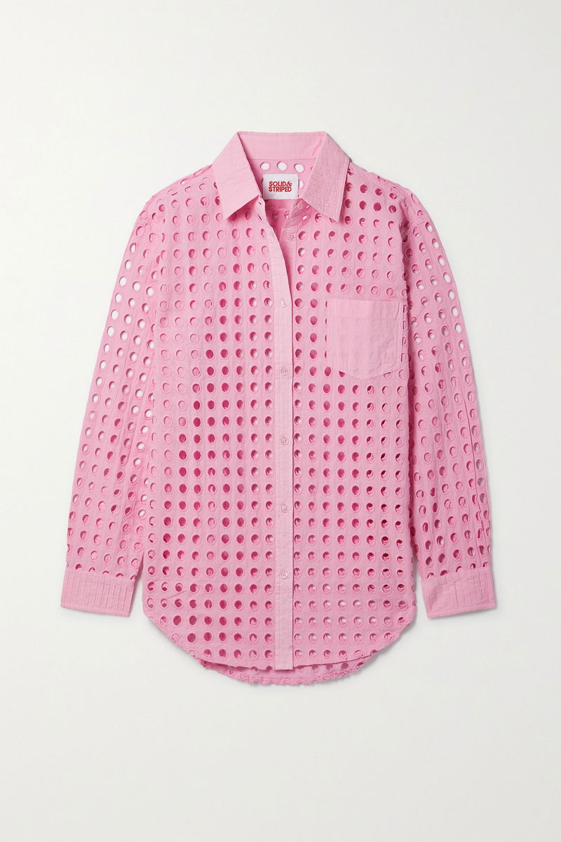 Solid & Striped's 'The Oxford' shirt is made from airy broderie anglaise cotton in a pretty pink hue. It's cut for a loose fit and has a smooth point collar and chest pocket. Wear yours over a swimsuit or tonal bra.