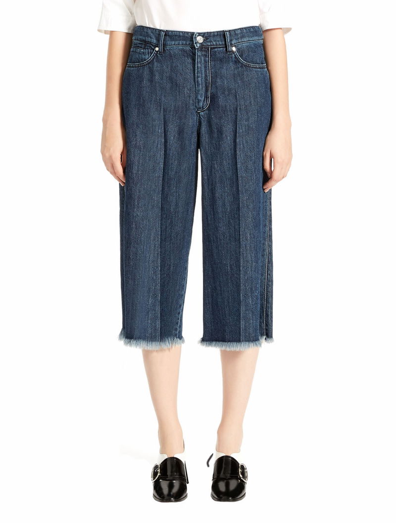 Culottes shows no sign of waning as the style du jour, as evidenced by this wide indigo denim style. Cropped just below the knee, the voluminous style makes the calves look slimmer, whilst the feather-like frayed edges are an elegant finishing touch.