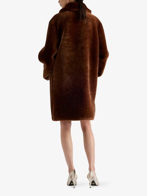 Stand Studio founder Nellie Kamras uses her family's leather expertise as a foundation to create statement pieces such as this tan-brown Adele coat from alternative materials. It has a panelled construction made from snake-effect faux leather outlined with glimpses of the ivory-white faux shearling lining inside.