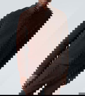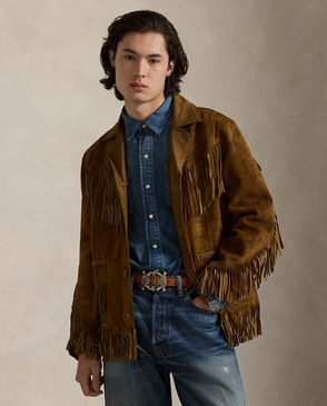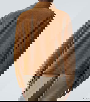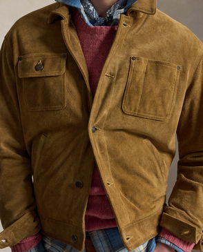Goat leather suede jacket. · Press-stud fastening at notched lapels· Zip closure · Zip and flap pockets · Adjustable pin-buckle belt at hem · Press-stud epaulettes · Zipped vent at cuffs · Full twill lining.