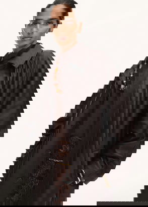 Crinkled grained faux-leather coat. · Spread collar · Double-breasted button closure · Welt pockets · Adjustable and detachable pin-buckle belt · Button tab at cuffs · Central vent at back hem · Full twill lining.