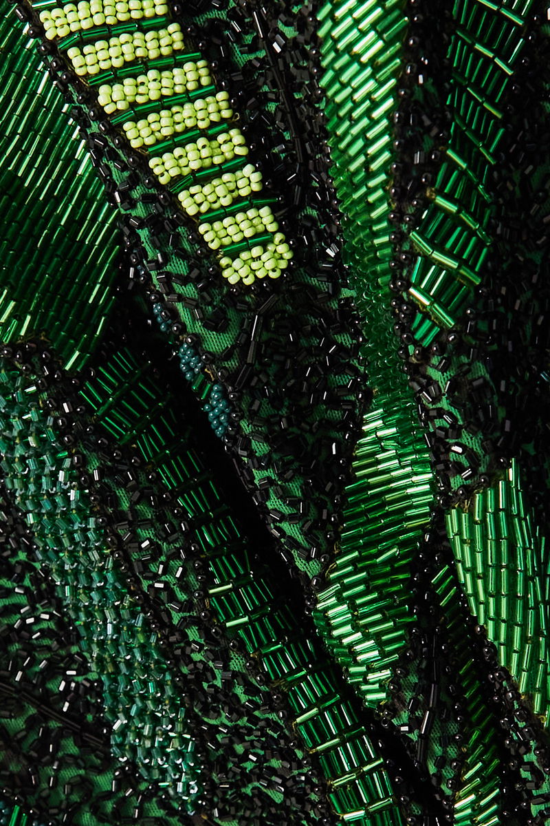 STAUD's dress is drenched in shimmering beads arranged in the shape of palm tree fronds, so it's only right to wear it somewhere tropical. It's cut from stretch-tulle for a close fit and has a split mini hem. Style it with strappy sandals and a micro bag on vacation.