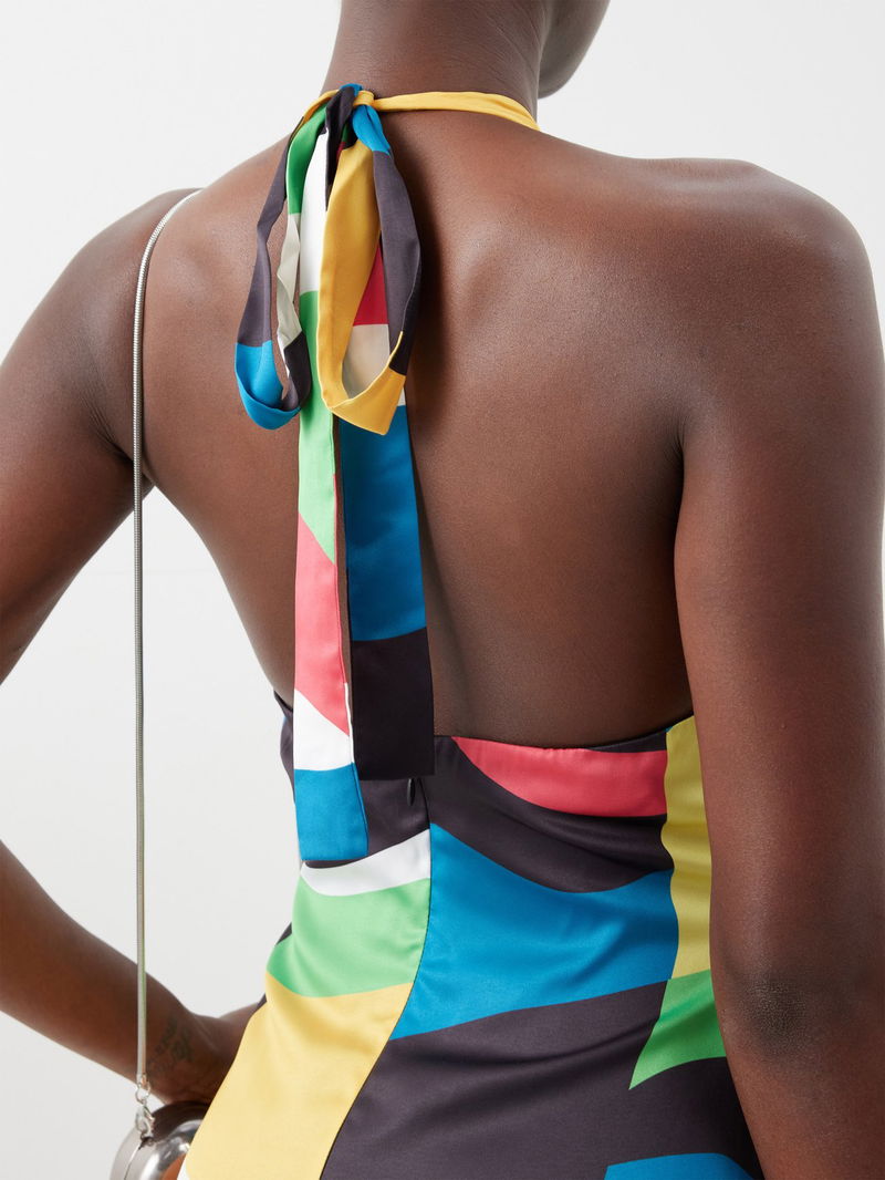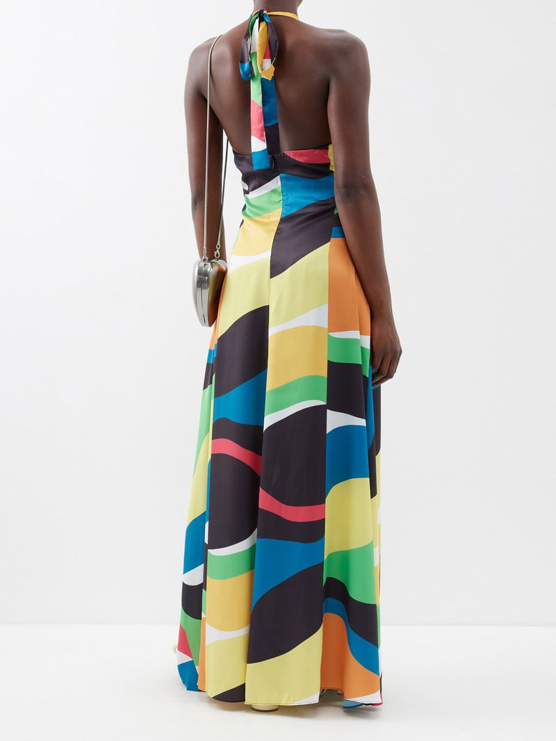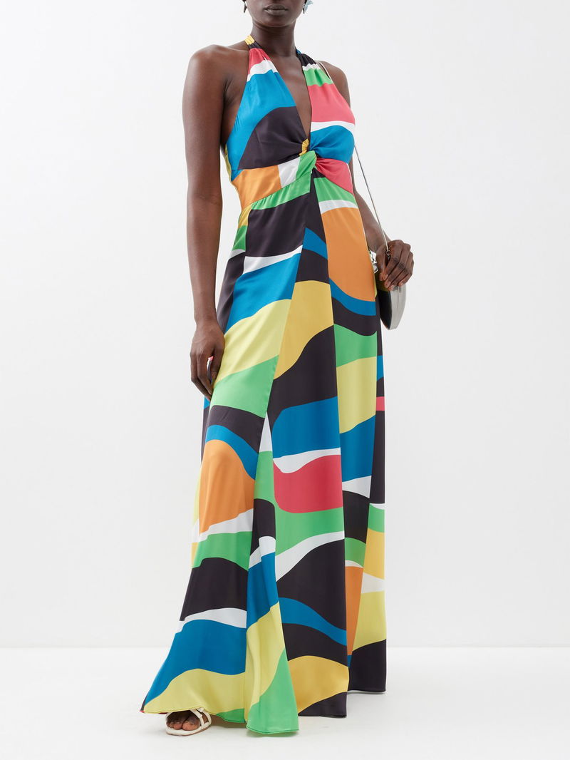 The vibrancy of Californian culture informs the geometric motif of Staud’s multicoloured Jennifer maxi dress, cut from fluid satin with a twisted V-neck.