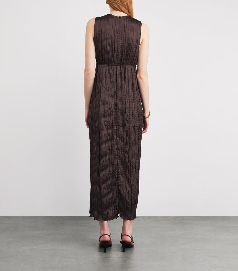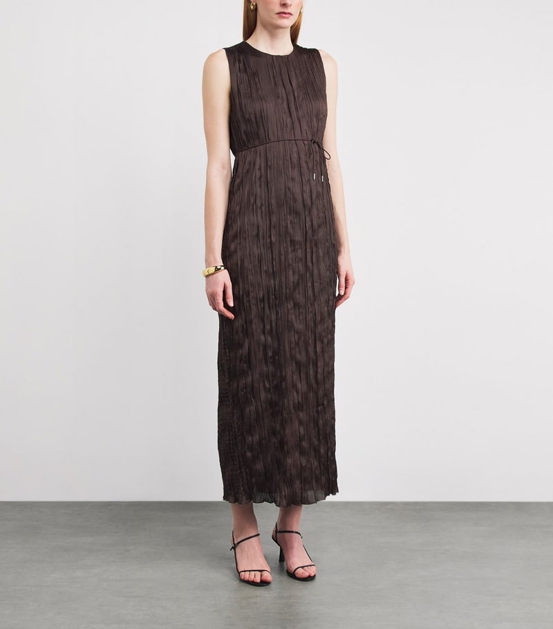 Cut to a midi length, the sleeveless number is characterised by a plissé exterior, crafted in a meticulous process for a striking update to the classic day dress.