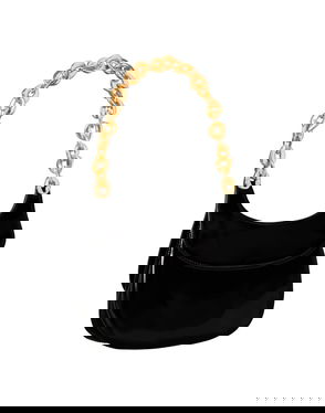 Staud's black Rey bag is reinterpreted with a thick gold chain-link strap, evoking a vintage mood. It's crafted from smooth leather to a triangular silhouette with a brushed interior and a practical zipped pocket.
