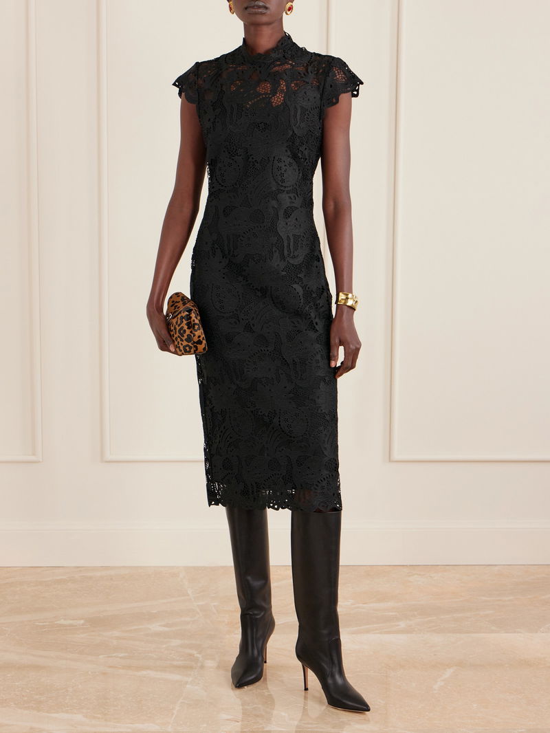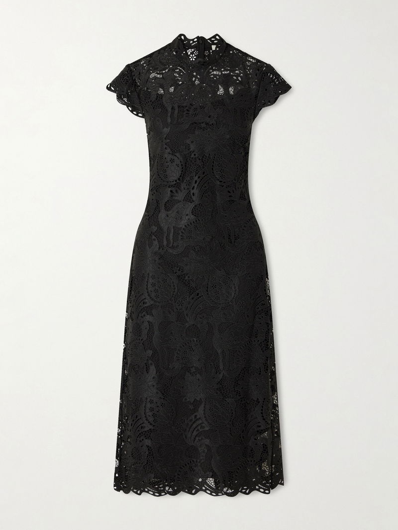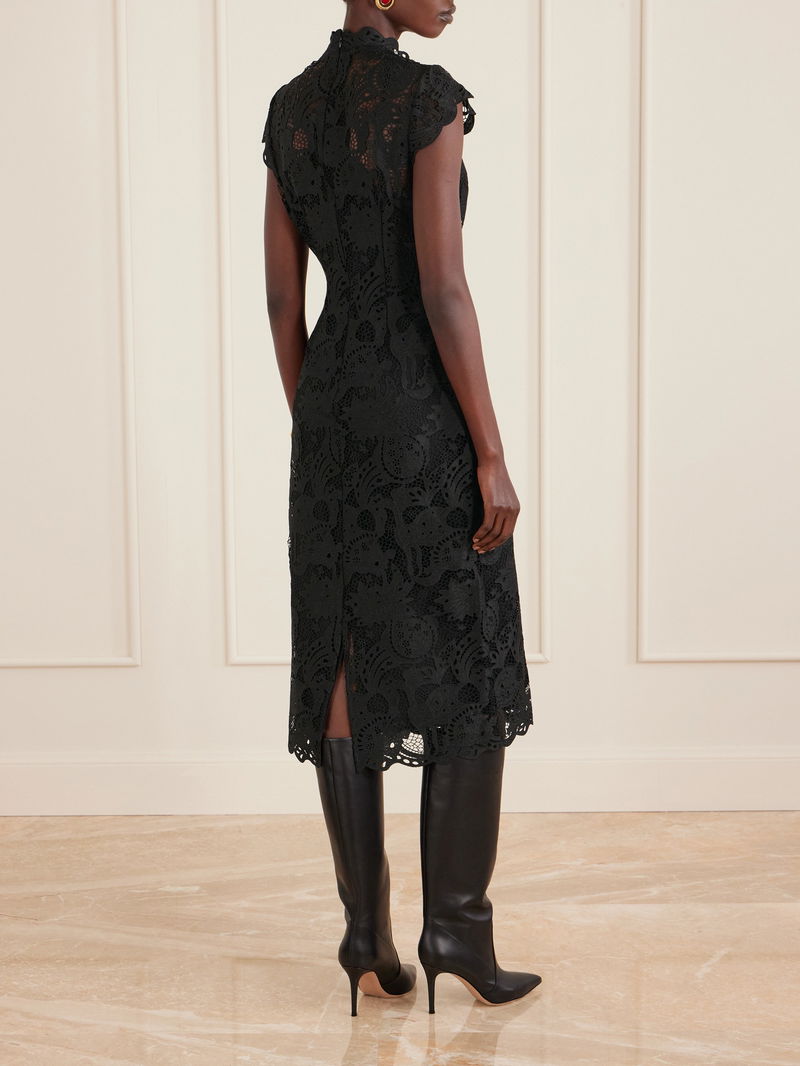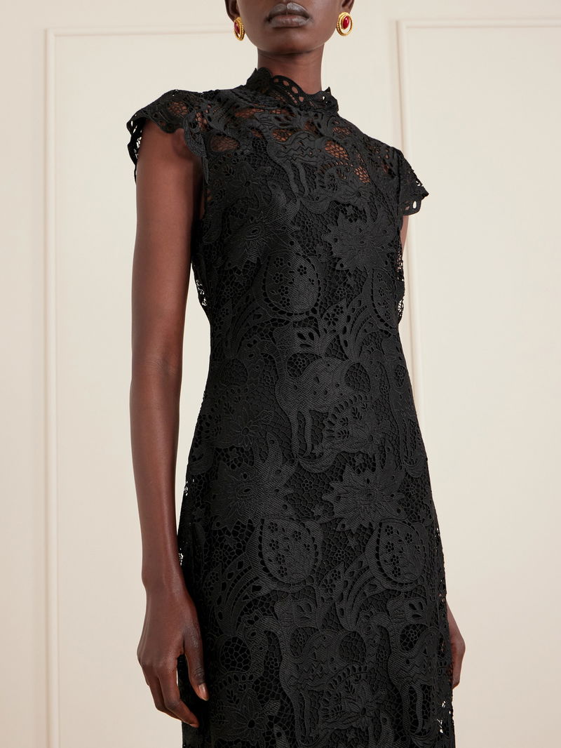 STAUD's 'Rosaline' dress is made from guipure lace and partially lined to give it a sheer neckline. It's framed by fluttery scalloped sleeves and skims your frame all the way to the midi hem. Style yours with all-black accessories.