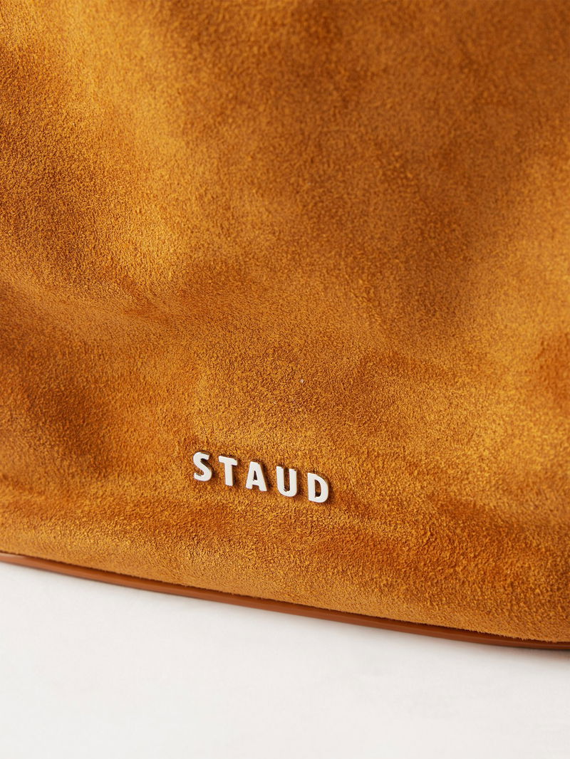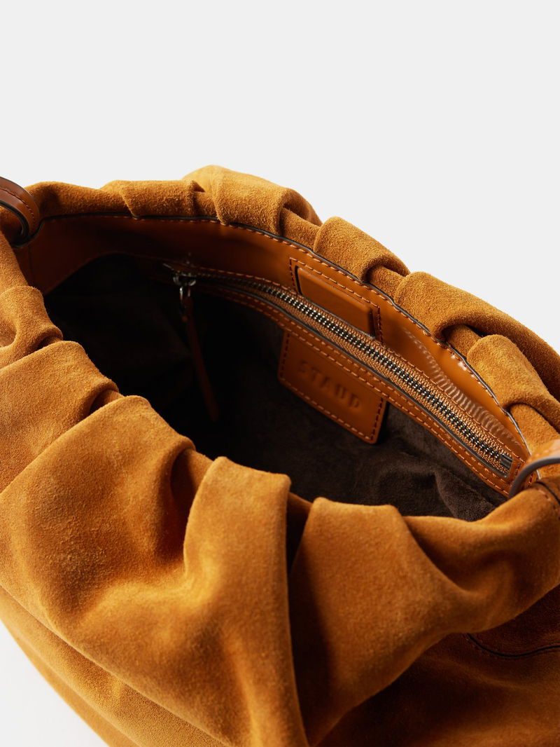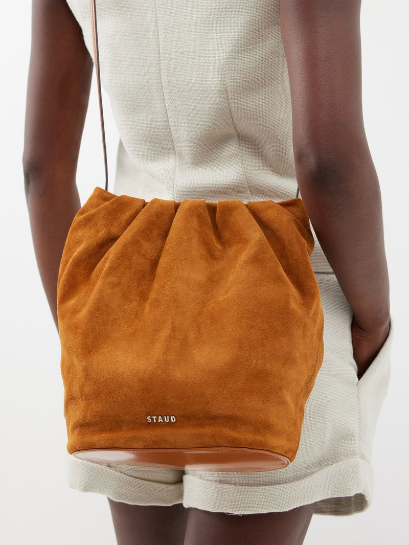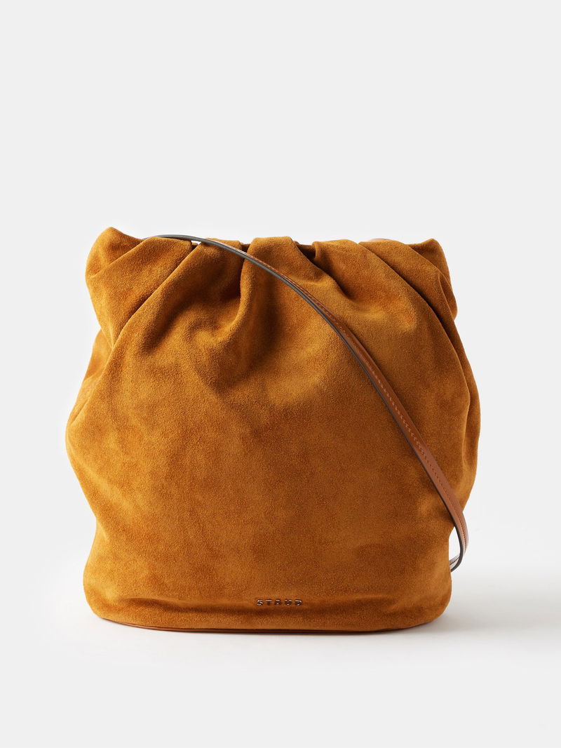 Augment your outfit by carrying this softly structured Valentina bucket bag, shaped from tan suede with a ruched top and a supple leather strap.