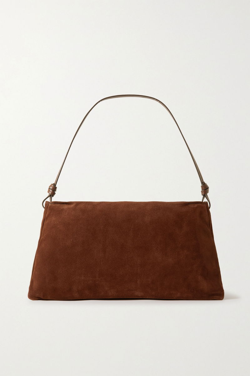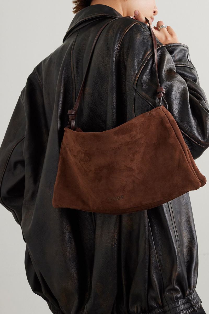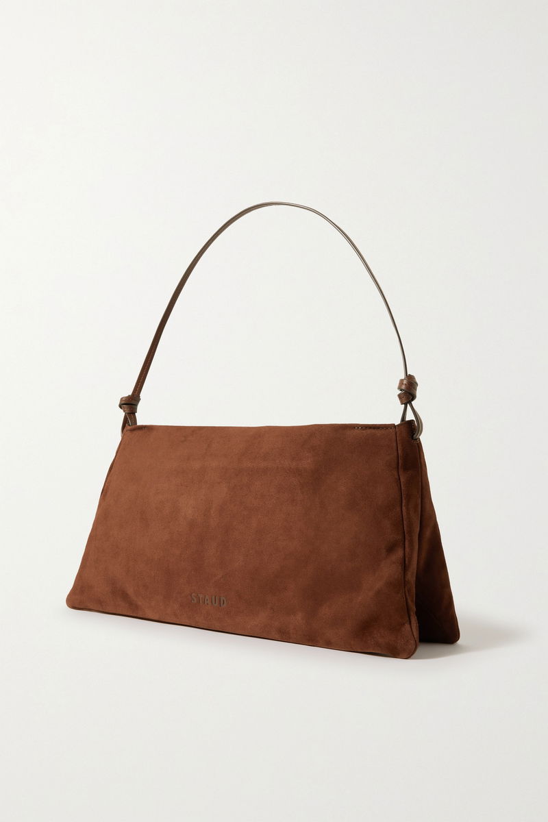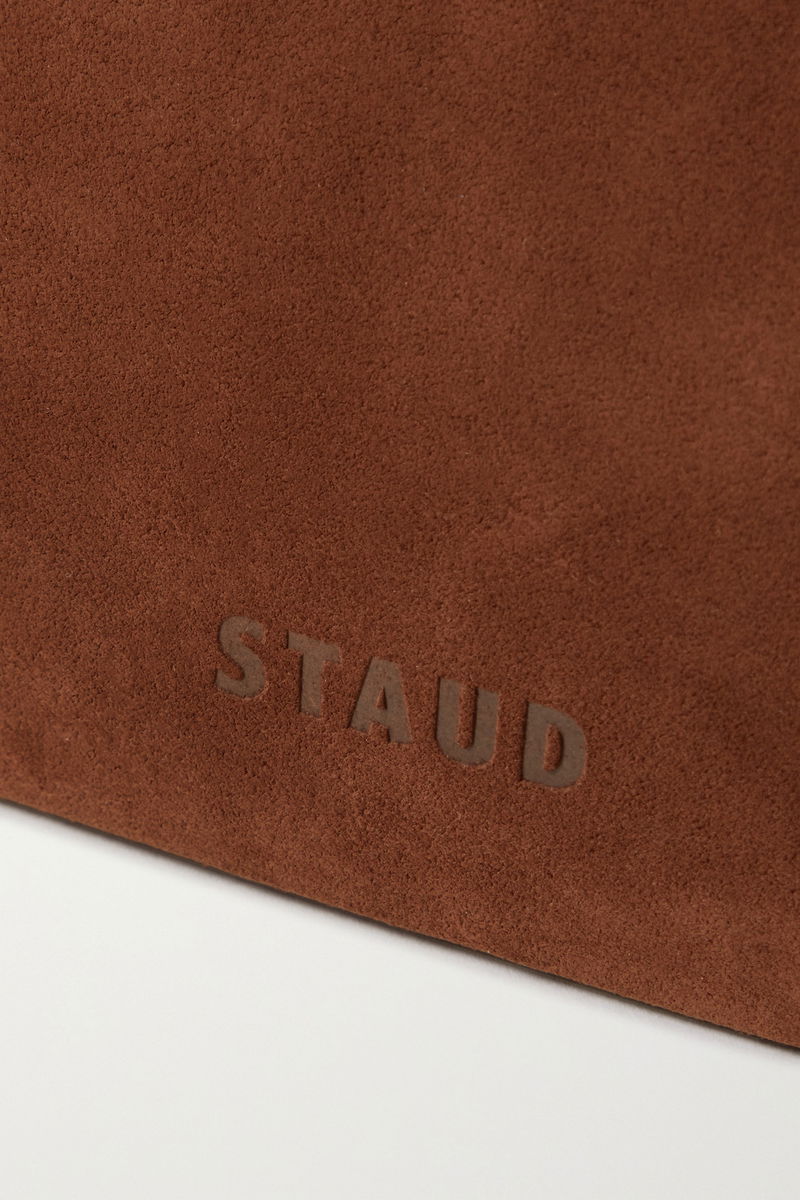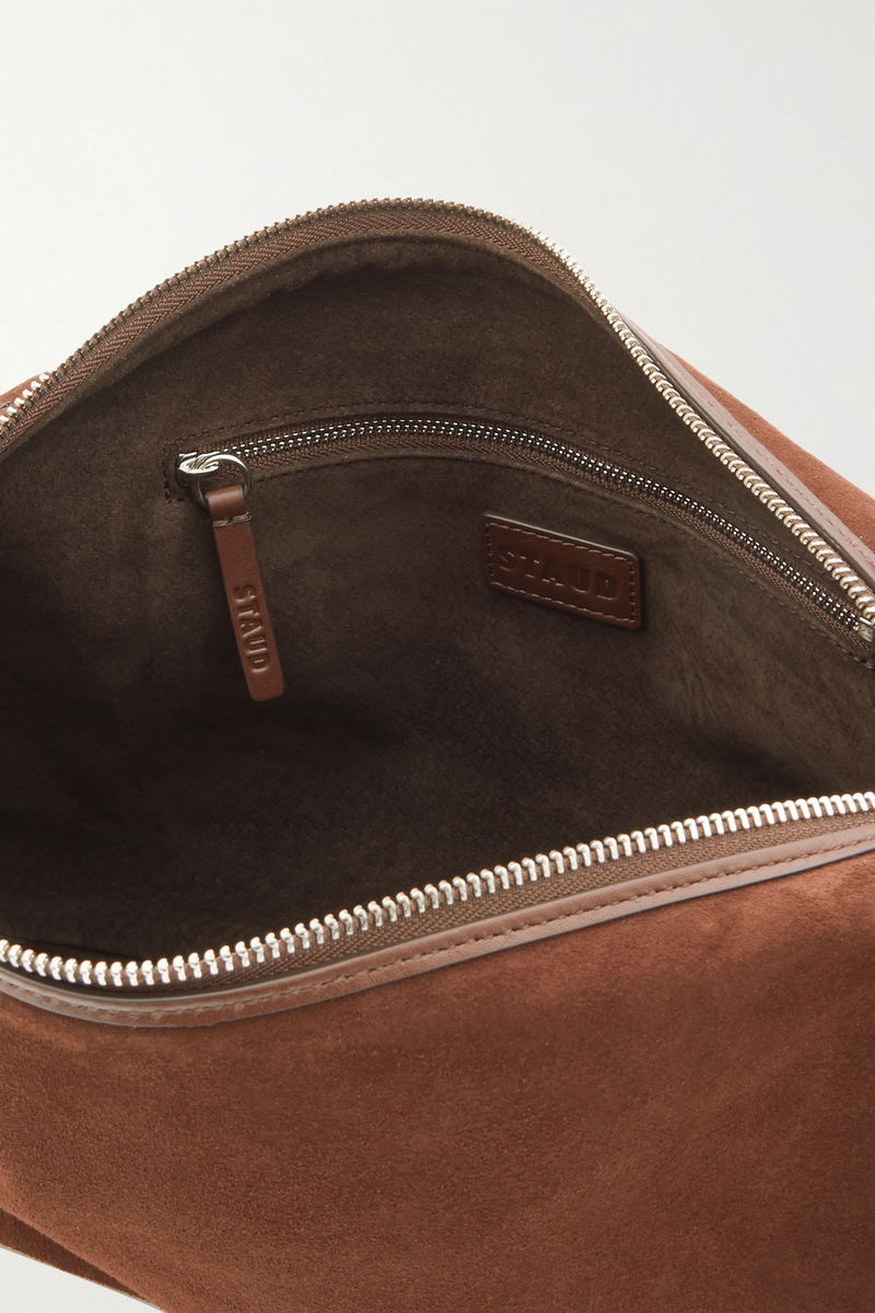 STAUD's 'Vivi' bag is an ode to '90s minimalism. Made from smooth suede in rich 'Mahogany', it has a knotted leather strap with tonal topstitching, and a zipped pocket inside.