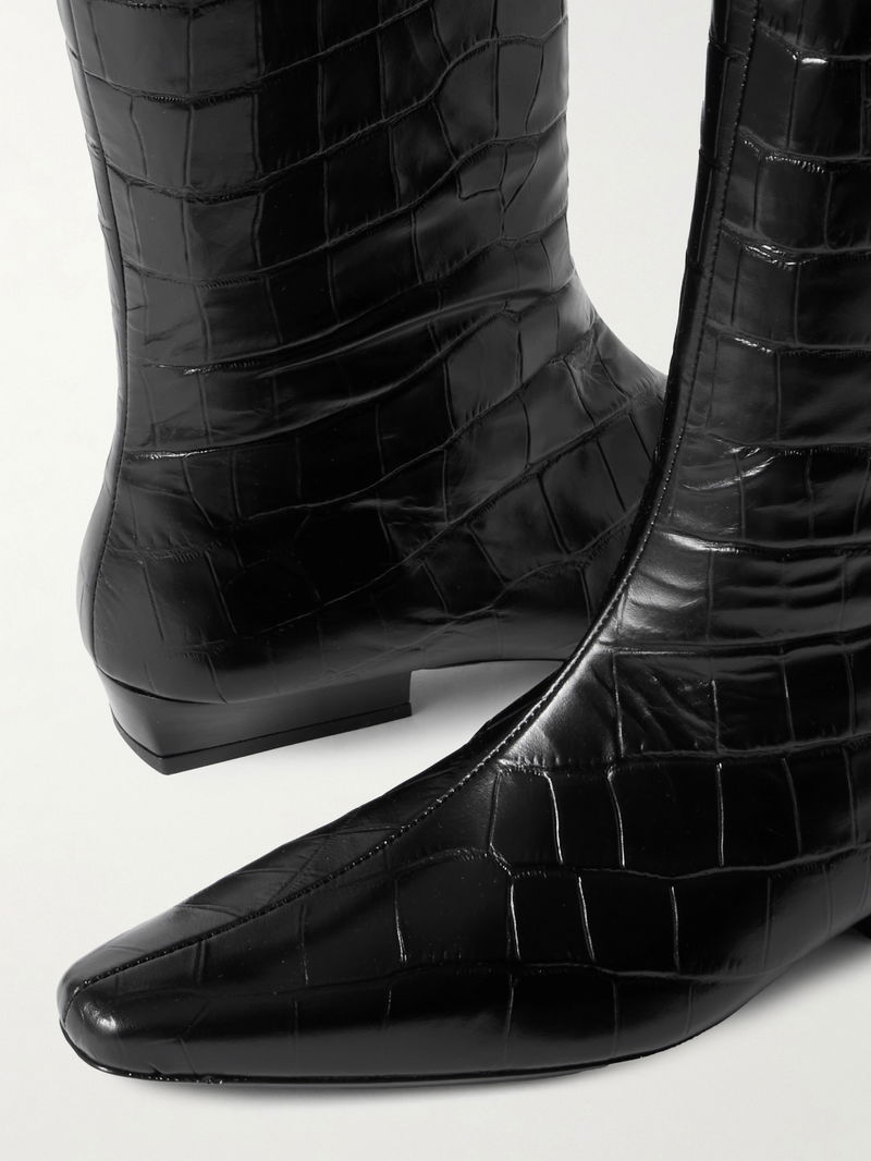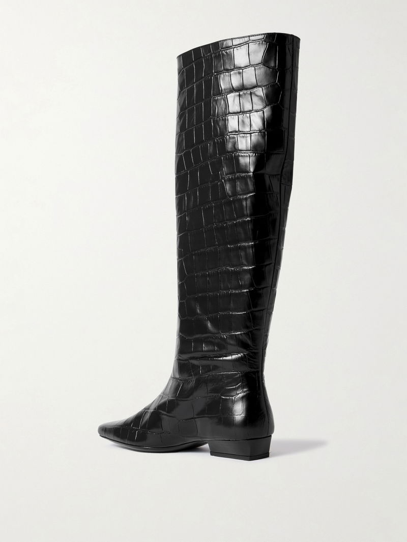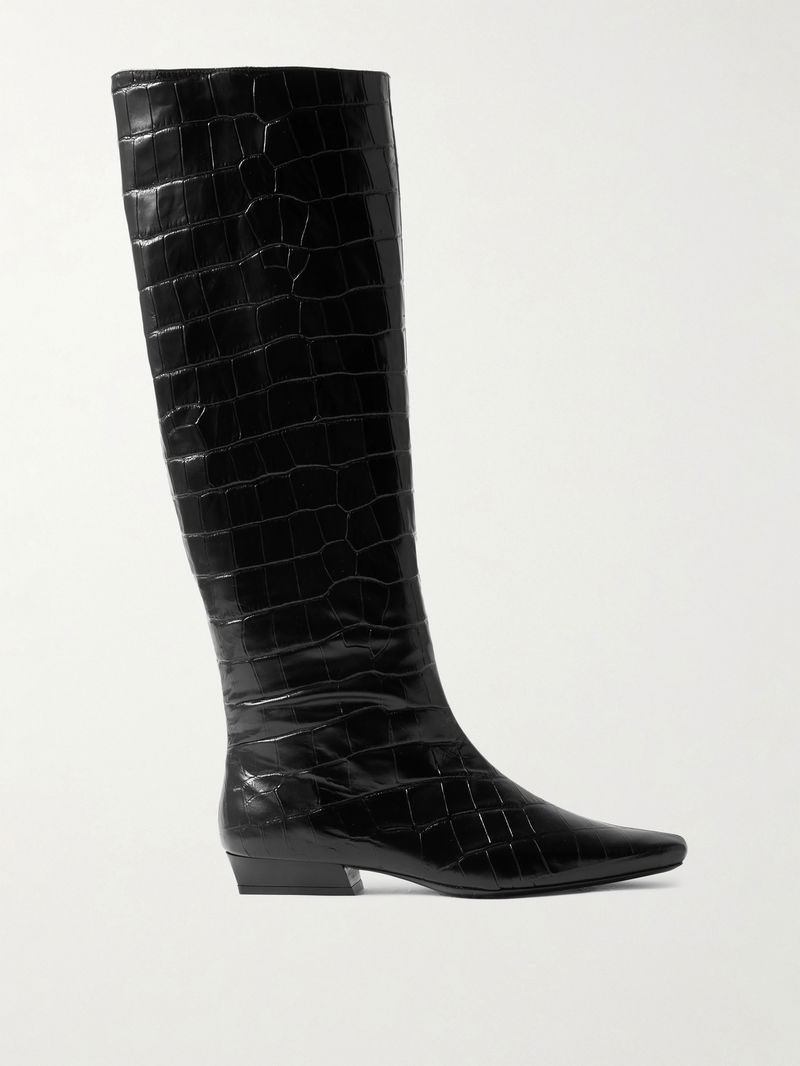 STAUD's updates its signature 'Wally' knee boots with a low heel inspired by Western styles. They're made from glossy croc-effect leather and have sleek elongated toes.