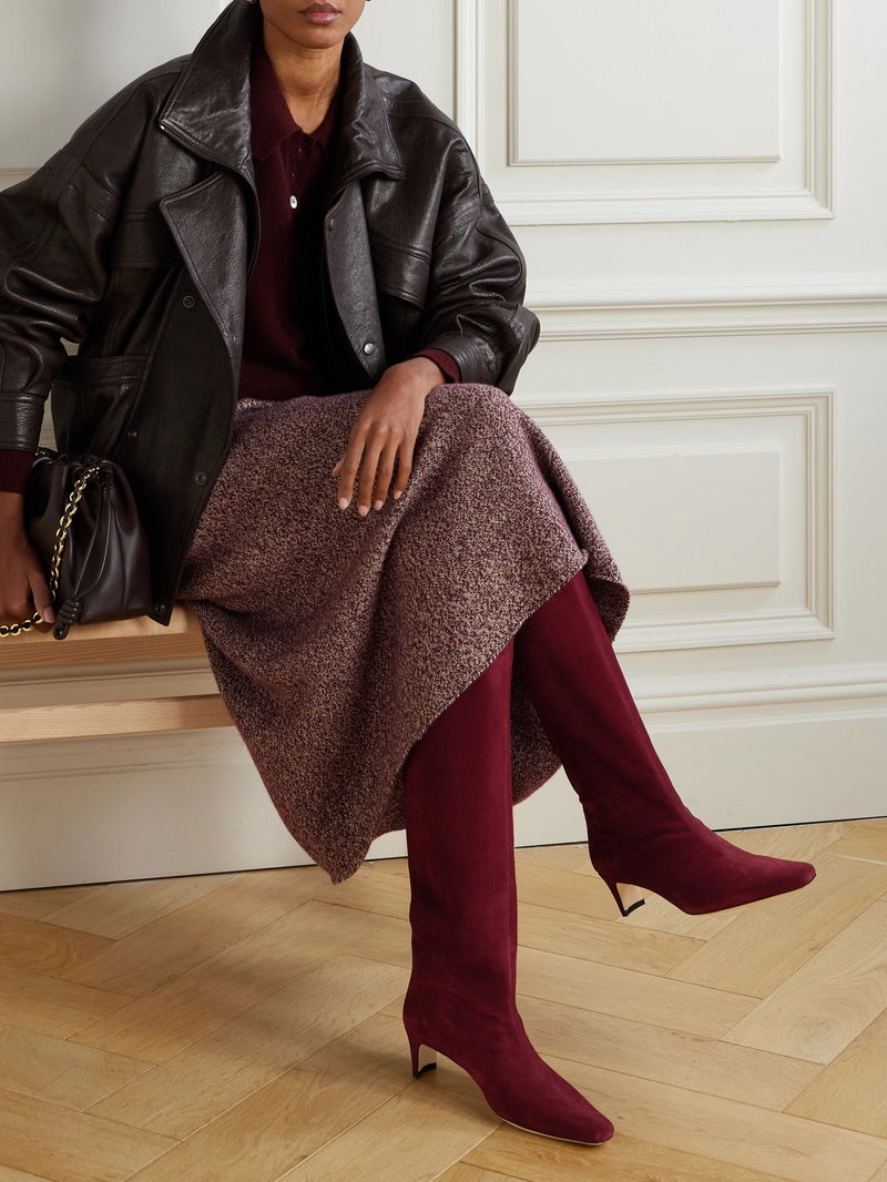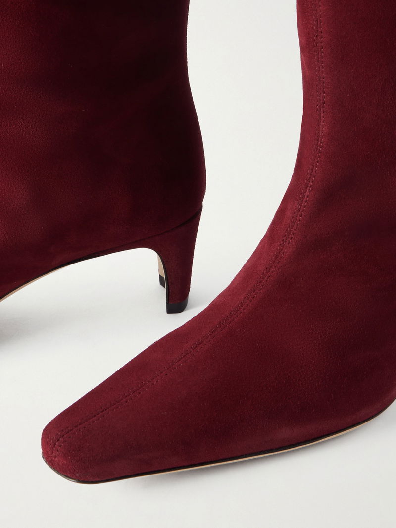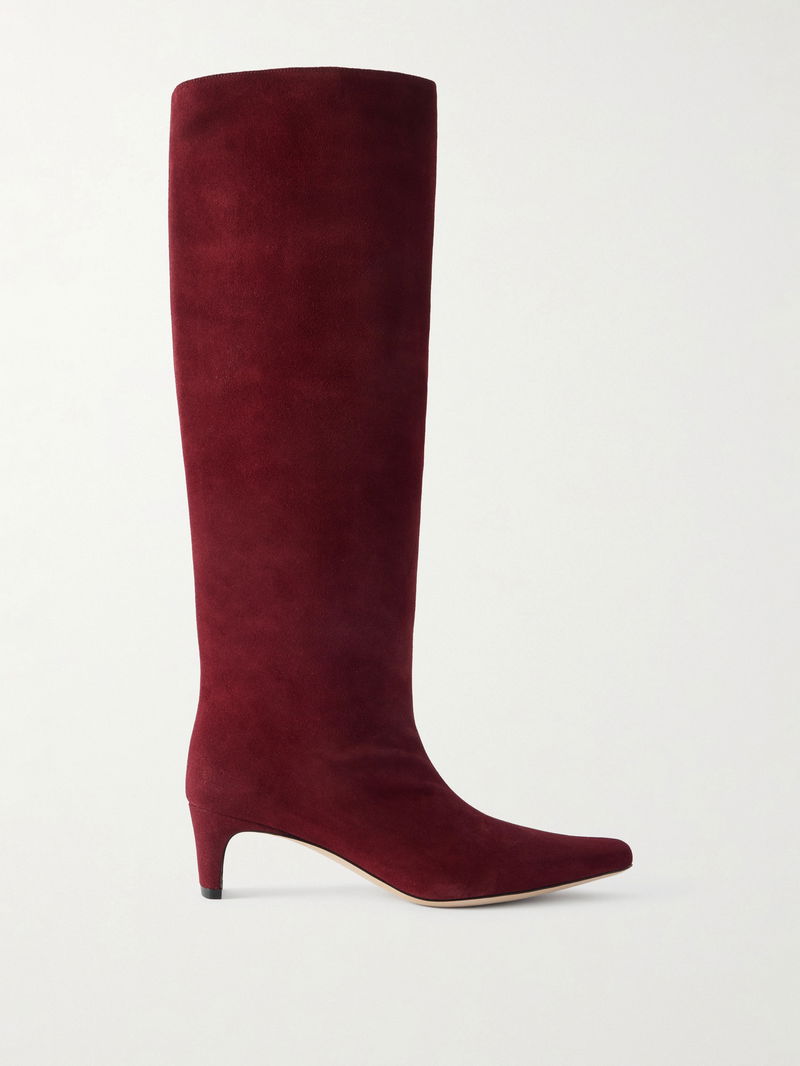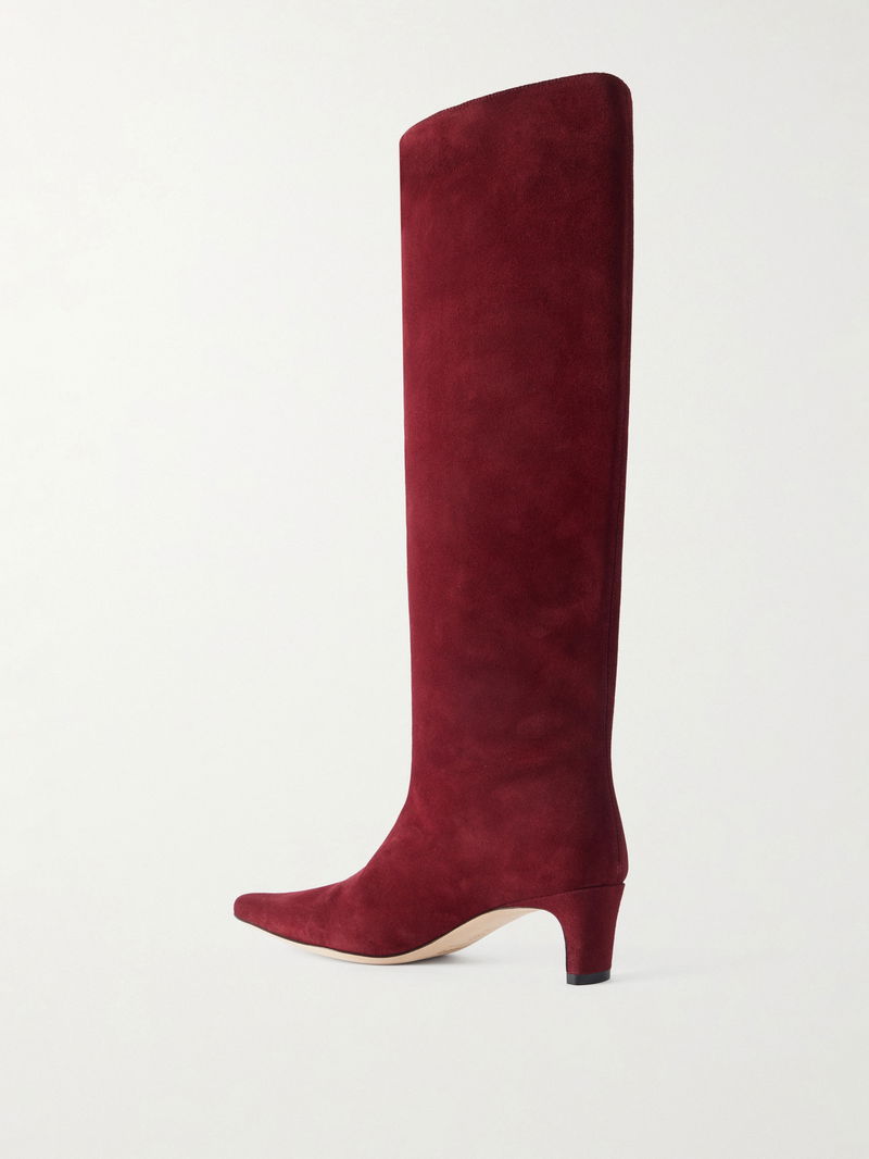 Made from versatile 'Pinot' suede, they have elongated square toes and sculptural kitten heels. The calf length complements both midi dresses and jeans.