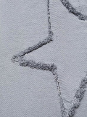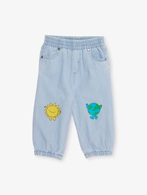 Stella McCartney Kids chambray trousers. Elasticated waistband, two slip pockets, faux fly, bumblebee print, ruffled cuffs, two patch pockets at back, designer plaque at back, faded finish.