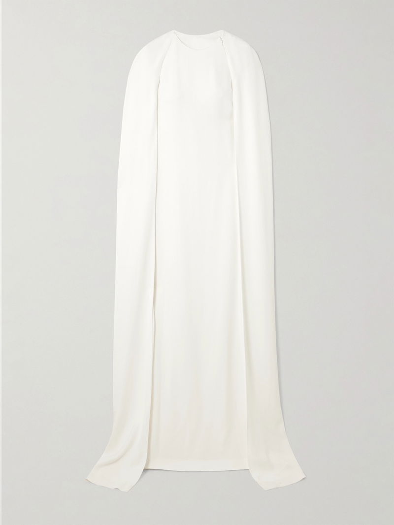 This exclusive evening capsule with Stella McCartney brings back iconic styles from the archives in fresh colorways. this gown is cut from stretch-cady to hug your curves and overlaid with a dramatic sweeping cape. Wear yours with diamond earrings and a plush velvet bag.