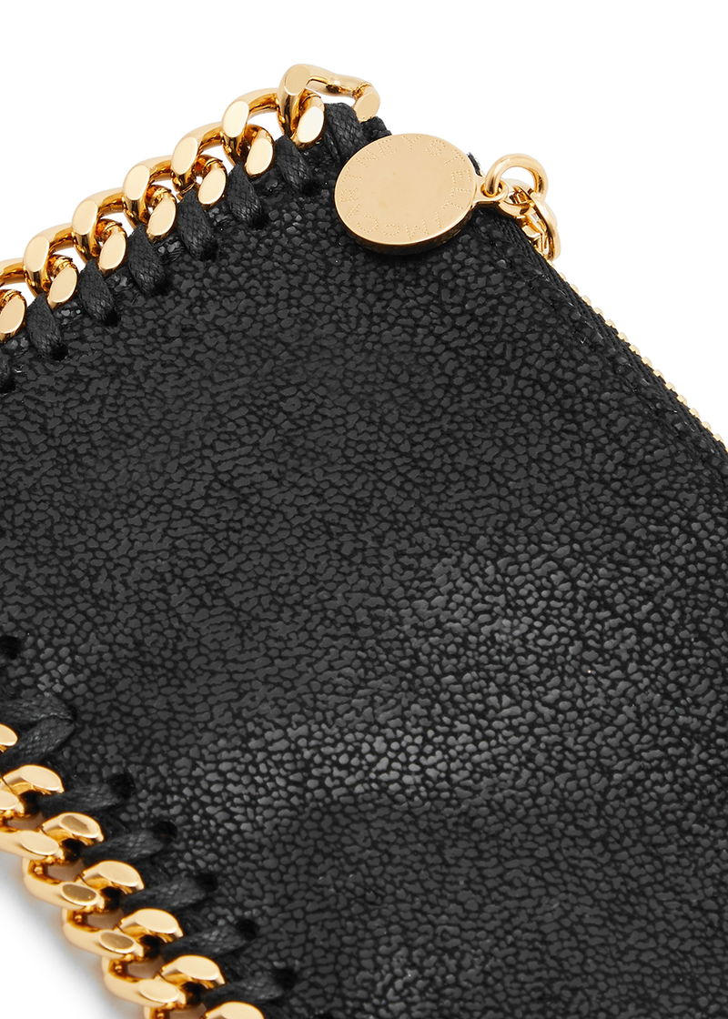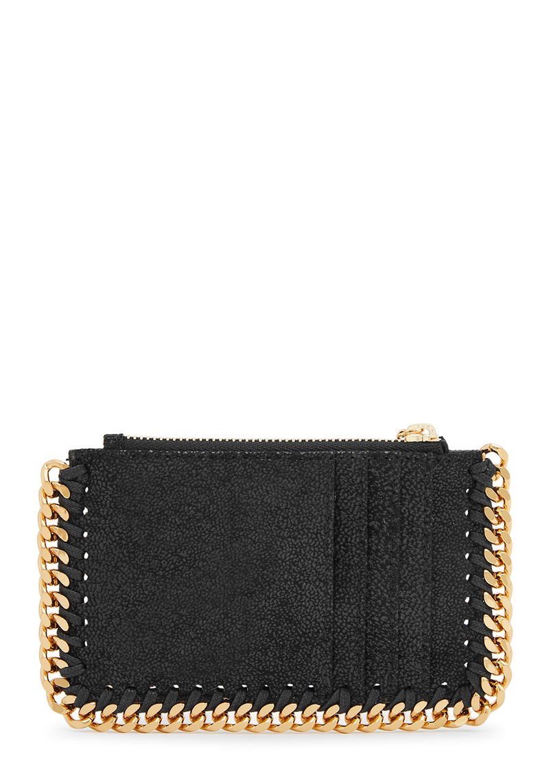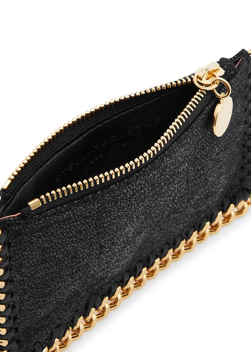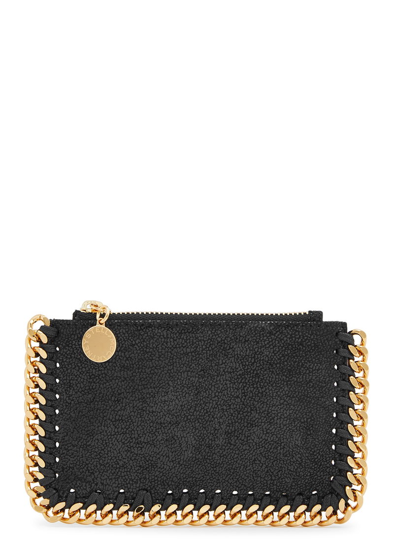 Hand-finished Stella McCartney faux suede card holder. Chain and faux leather whipstitch trim, designer hanging tag, four card slots, fully lined. Zip fastening across top.