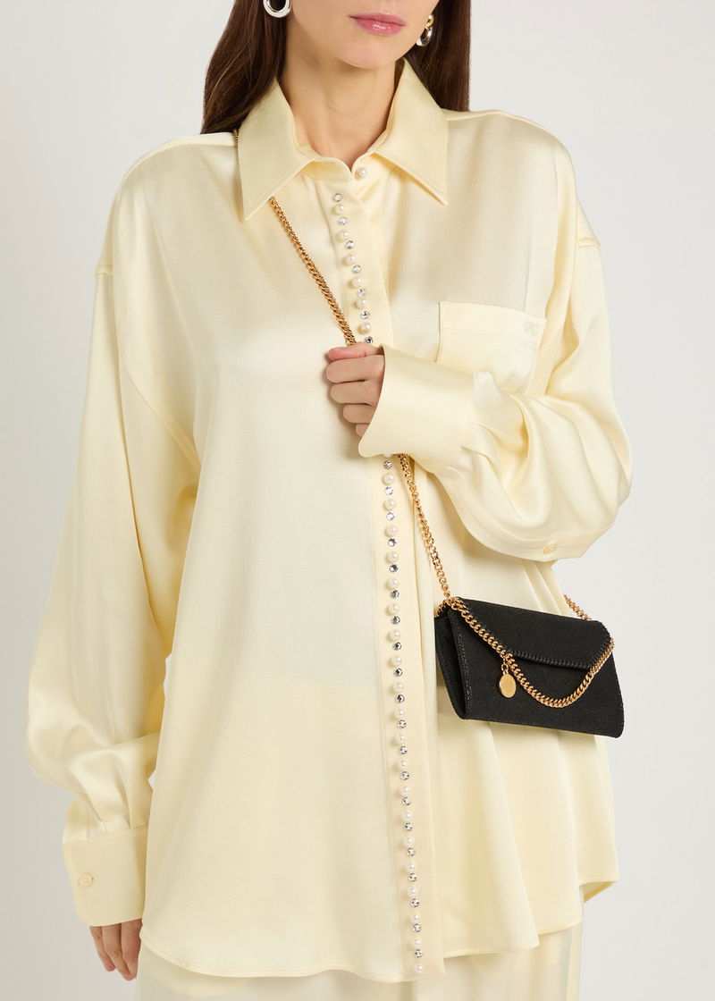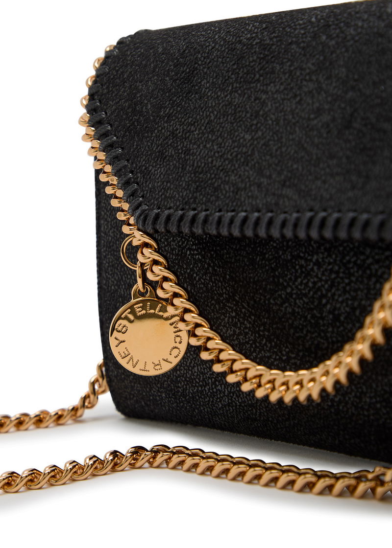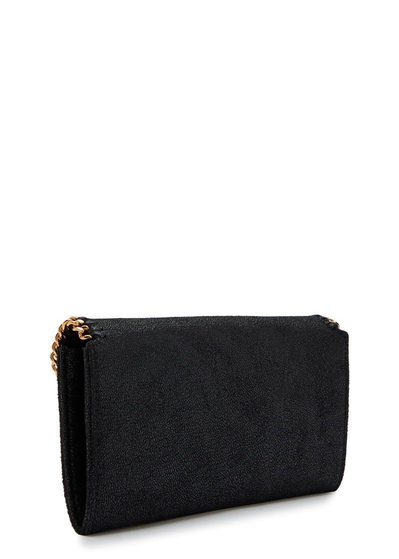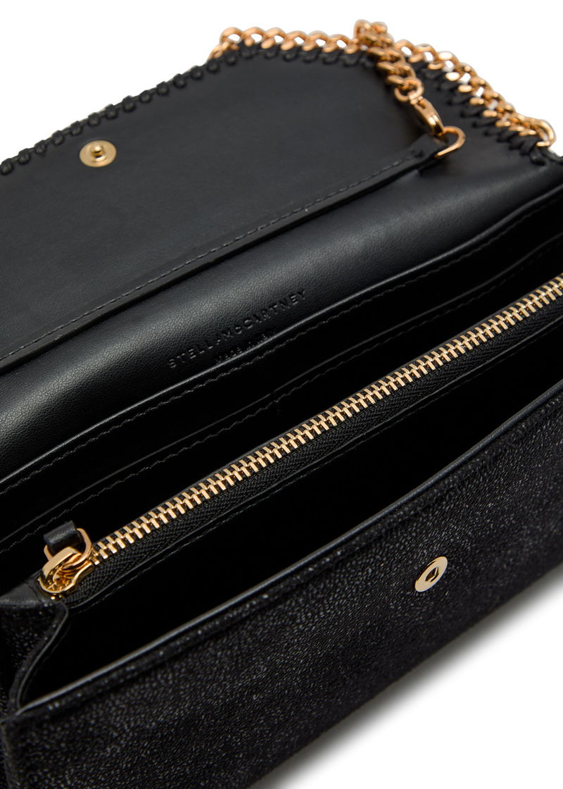 Stella McCartney faux suede wallet-on-chain. Detachable chain shoulder strap, signature leather and chain whip stitching, designer-engraved tag, grained finish, three internal slip pockets, six internal card slots, fully lined