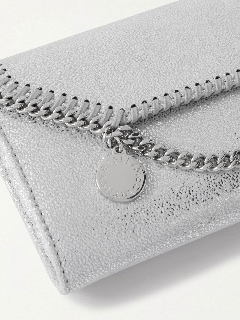 Crafted from silver vegan material, it’s framed with the label’s signature diamond-cut chain trim and lined with a practical interior featuring card slots and a zipped pocket.