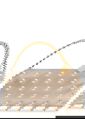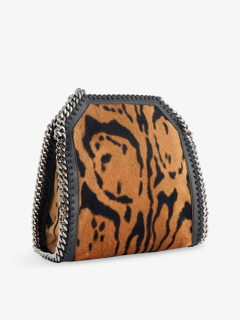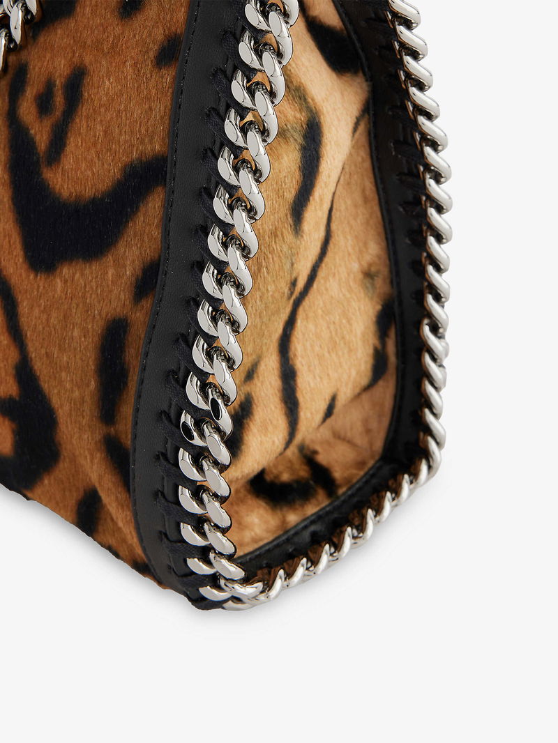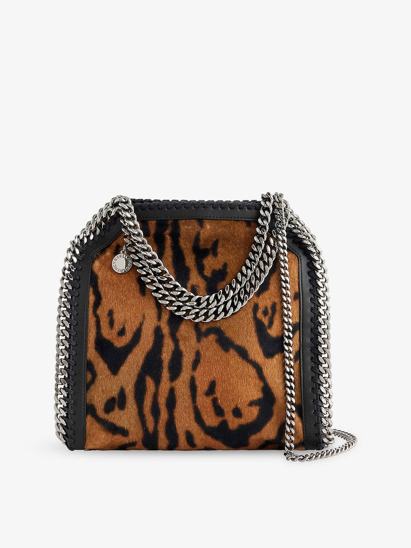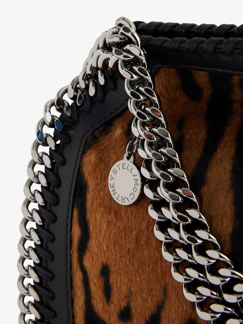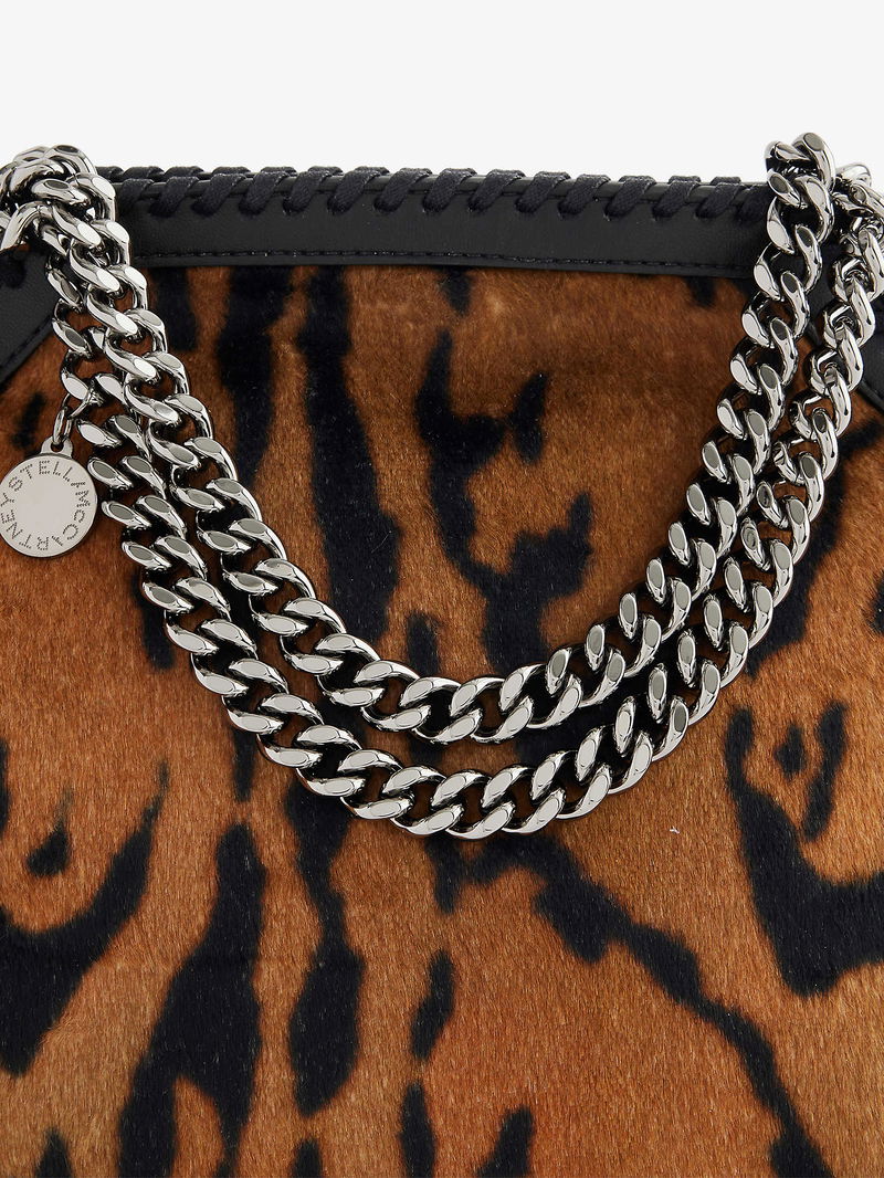 Stella McCartney woven tote bag. Open top with press-stud closure. Slouch shape, double chain handles, chain shoulder strap, brand charm, one main compartment, internal slip pocket, chain trim, silver-toned hardware, all-over animal pattern.