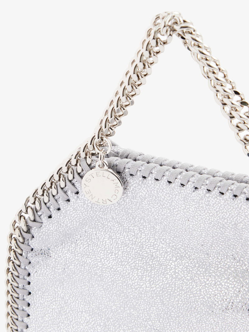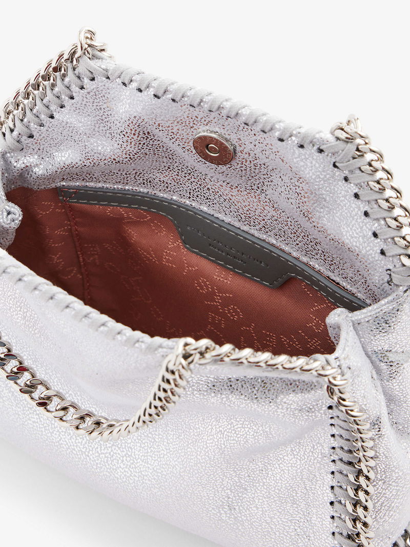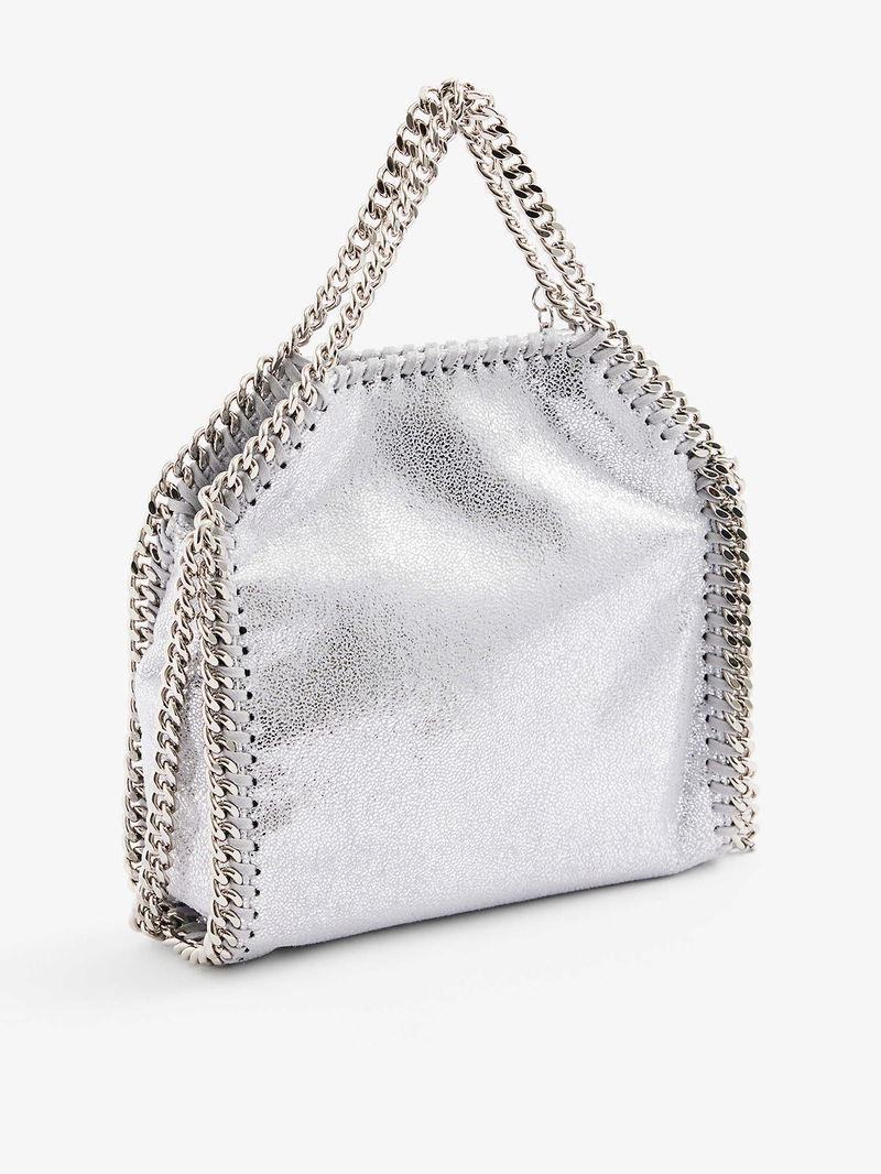 Stella McCarrtney faux-suede crossbody bag. Open top with pressed stud closure Slouch shape, double chain handles, chain shoulder strap, brand charm, one main compartment, internal slip pocket, chain trim, metallic finish, silver-toned hardware.