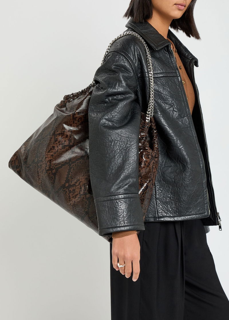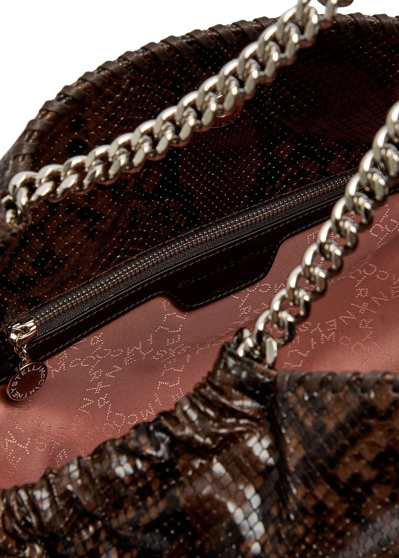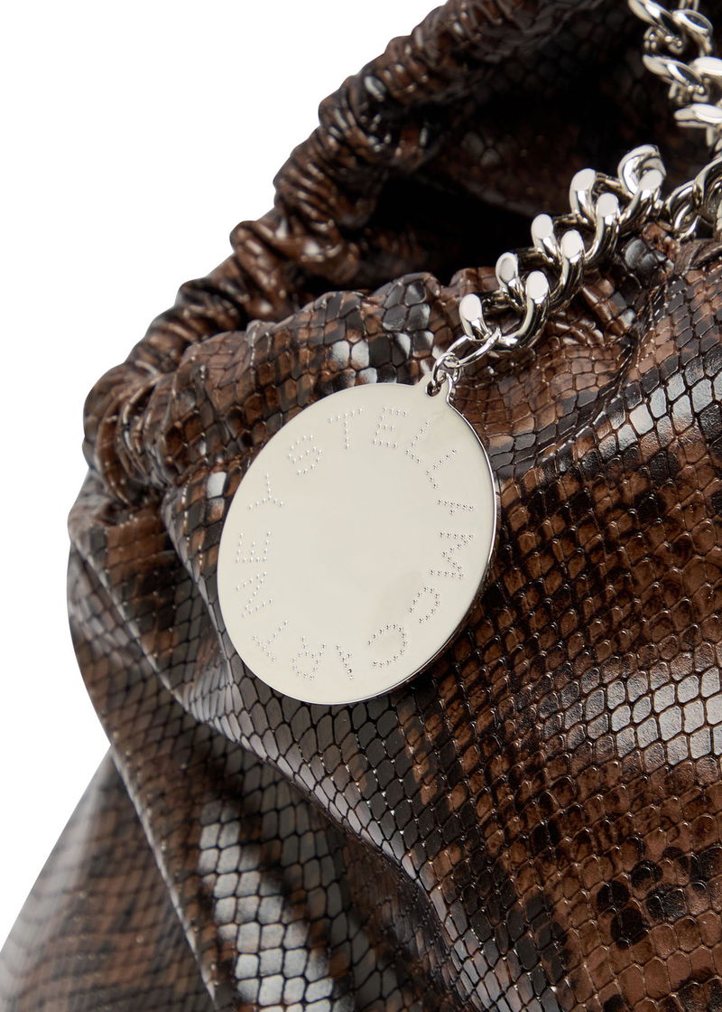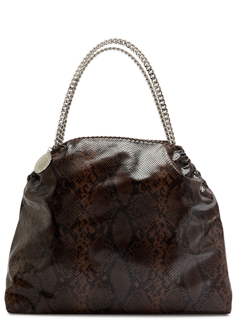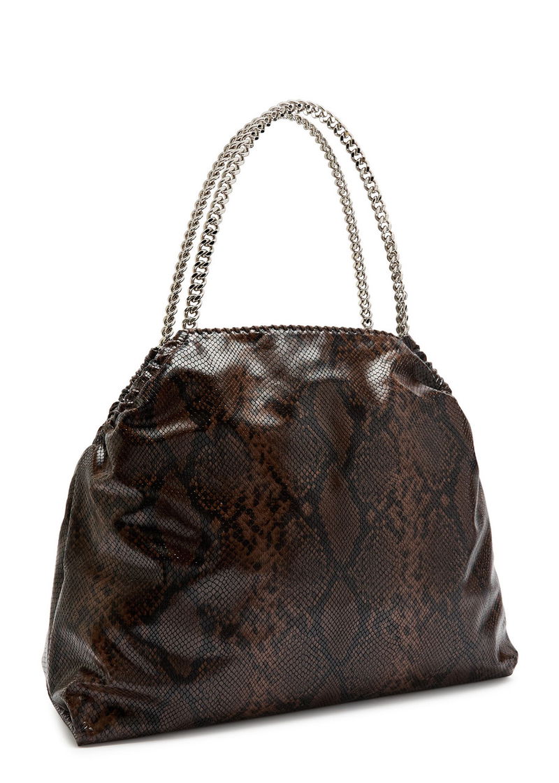 Stella McCartney faux leather tote. Textured python effect, two chain top handles, whipstitch trim, designer hanging tag, internal zip-fastening pocket, fully lined.