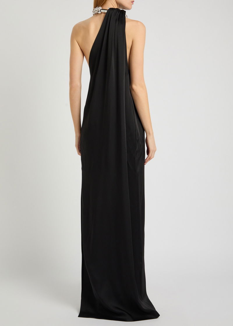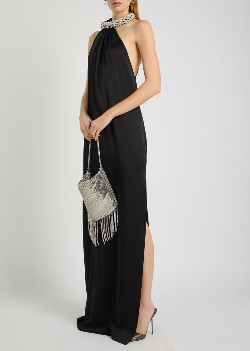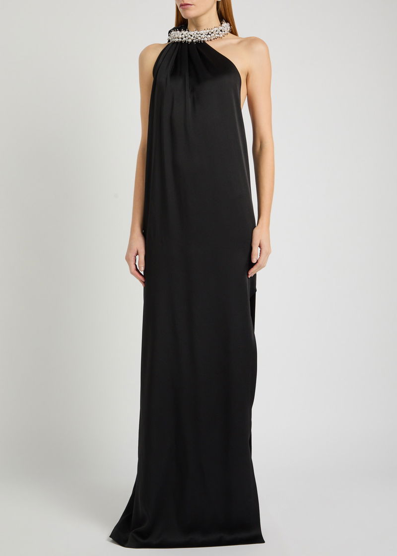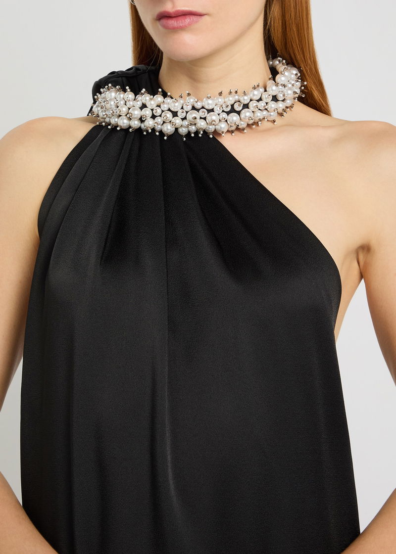 • Draped, asymmetric halterneck with faux pearl embellishments, wrap-over bust, side slip pockets, side split
