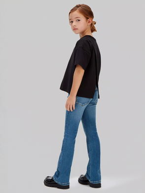 Stella McCartney Kids stretch-denim jeans. Belt loops, five pockets, designer-engraved button embellishment, embossed logo at sides through legs, pressed creases through legs, designer plaque at back, faded finish. Concealed hook and zip fastenings at front.