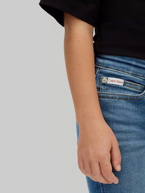 Stella McCartney Kids stretch-denim jeans. Adjustable elasticated waistband, belt loops, five pockets, embossed logo at sides, designer plaque at back, signature embroidery at back pocket, faded finish. Partially concealed zip and button fastening at front.