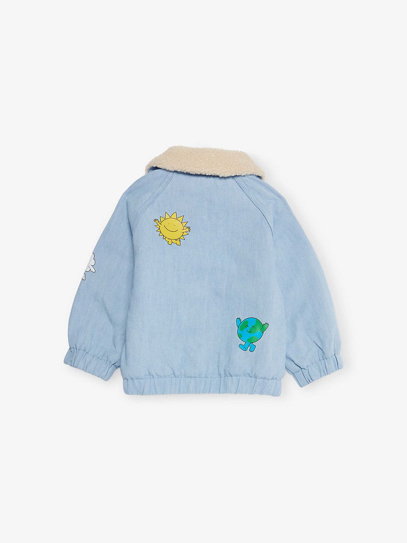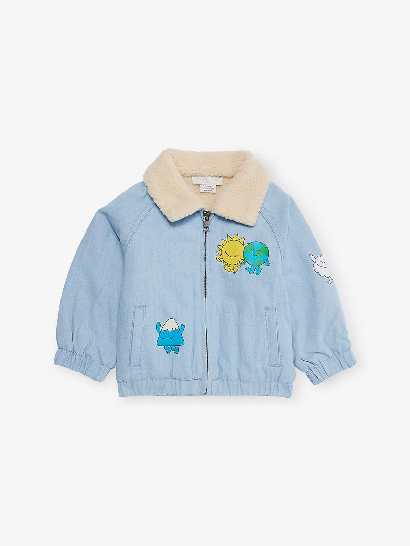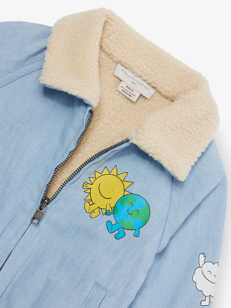 Stella McCartney denim jacket. Concealed zip fastening at front. Regular fit, fleece spread collar, raglan long sleeves, two welt pockets at front, graphic print at front and back, all-over padded, fleece lining, elasticated trims.