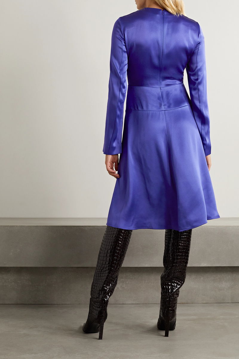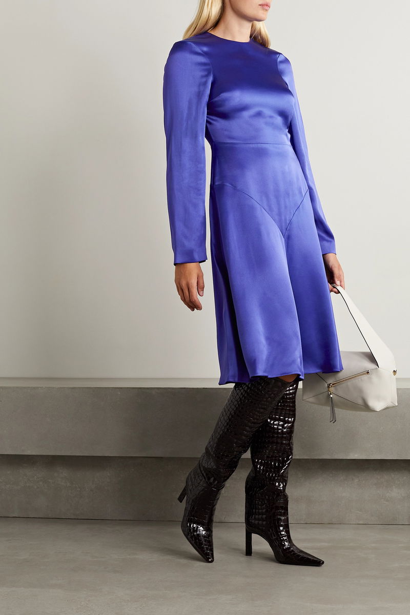 Stella McCartney's dress is made from smooth satin in a vibrant purple hue. It has strategically placed seams at the waist and hips before falling to a floaty skirt. Wear yours with knee boots.